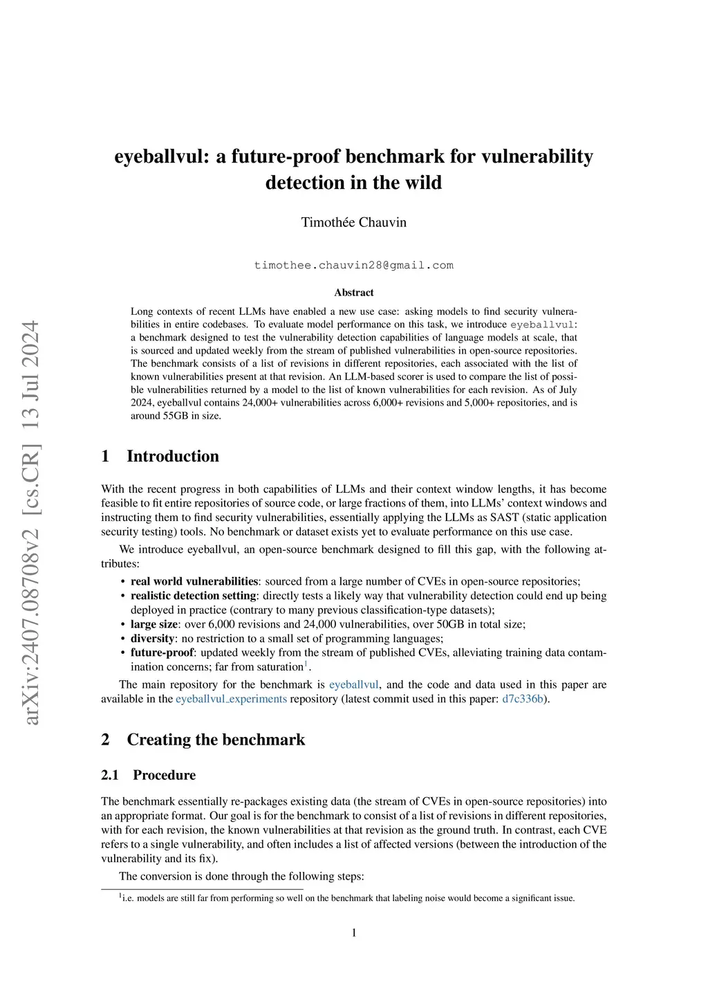 Long contexts of recent LLMs have enabled a new use case: asking models to find security vulnerabilities in entire codebases. To evaluate model performance on this task, we introduce eyeballvul: a benchmark designed to test the vulnerability detection capabilities of language models at scale, that is sourced and updated weekly from the stream of published vulnerabilities in open-source repositories. The benchmark consists of a list of revisions in different repositories, each associated with the list of known vulnerabilities present at that revision. An LLM-based scorer is used to compare the list of possible vulnerabilities returned by a model to the list of known vulnerabilities for each revision. As of July 2024, eyeballvul contains 24,000+ vulnerabilities across 6,000+ revisions and 5,000+ repositories, and is around 55GB in size.
