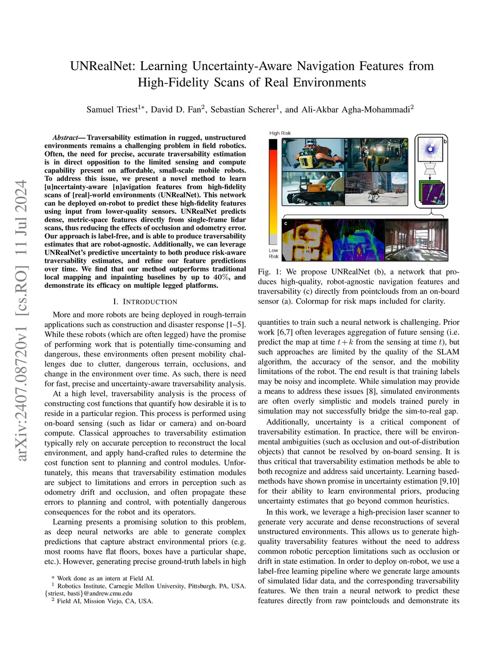 Traversability estimation in rugged, unstructured environments remains a challenging problem in field robotics. Often, the need for precise, accurate traversability estimation is in direct opposition to the limited sensing and compute capability present on affordable, small-scale mobile robots. To address this issue, we present a novel method to learn [u]ncertainty-aware [n]avigation features from high-fidelity scans of [real]-world environments (UNRealNet). This network can be deployed on-robot to predict these high-fidelity features using input from lower-quality sensors. UNRealNet predicts dense, metric-space features directly from single-frame lidar scans, thus reducing the effects of occlusion and odometry error. Our approach is label-free, and is able to produce traversability estimates that are robot-agnostic. Additionally, we can leverage UNRealNet's predictive uncertainty to both produce risk-aware traversability estimates, and refine our feature predictions over time. We find that our method outperforms traditional local mapping and inpainting baselines by up to 40%, and demonstrate its efficacy on multiple legged platforms.