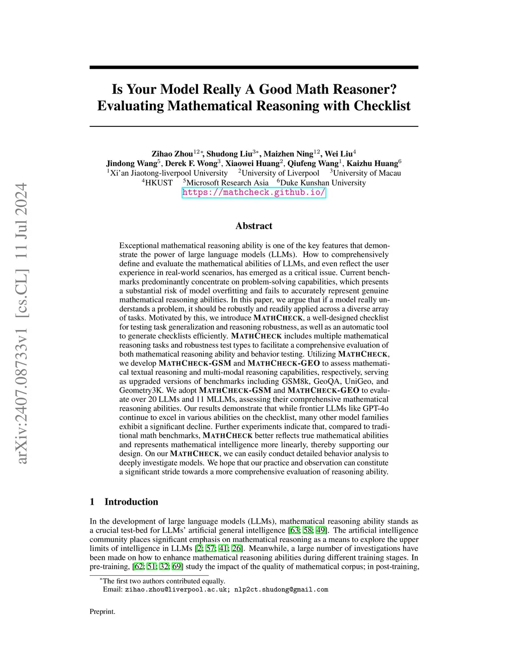 Exceptional mathematical reasoning ability is one of the key features that demonstrate the power of large language models (LLMs). How to comprehensively define and evaluate the mathematical abilities of LLMs, and even reflect the user experience in real-world scenarios, has emerged as a critical issue. Current benchmarks predominantly concentrate on problem-solving capabilities, which presents a substantial risk of model overfitting and fails to accurately represent genuine mathematical reasoning abilities. In this paper, we argue that if a model really understands a problem, it should be robustly and readily applied across a diverse array of tasks. Motivated by this, we introduce MATHCHECK, a well-designed checklist for testing task generalization and reasoning robustness, as well as an automatic tool to generate checklists efficiently. MATHCHECK includes multiple mathematical reasoning tasks and robustness test types to facilitate a comprehensive evaluation of both mathematical reasoning ability and behavior testing. Utilizing MATHCHECK, we develop MATHCHECK-GSM and MATHCHECK-GEO to assess mathematical textual reasoning and multi-modal reasoning capabilities, respectively, serving as upgraded versions of benchmarks including GSM8k, GeoQA, UniGeo, and Geometry3K. We adopt MATHCHECK-GSM and MATHCHECK-GEO to evaluate over 20 LLMs and 11 MLLMs, assessing their comprehensive mathematical reasoning abilities. Our results demonstrate that while frontier LLMs like GPT-4o continue to excel in various abilities on the checklist, many other model families exhibit a significant decline. Further experiments indicate that, compared to traditional math benchmarks, MATHCHECK better reflects true mathematical abilities and represents mathematical intelligence more linearly, thereby supporting our design. On our MATHCHECK, we can easily conduct detailed behavior analysis to deeply investigate models.