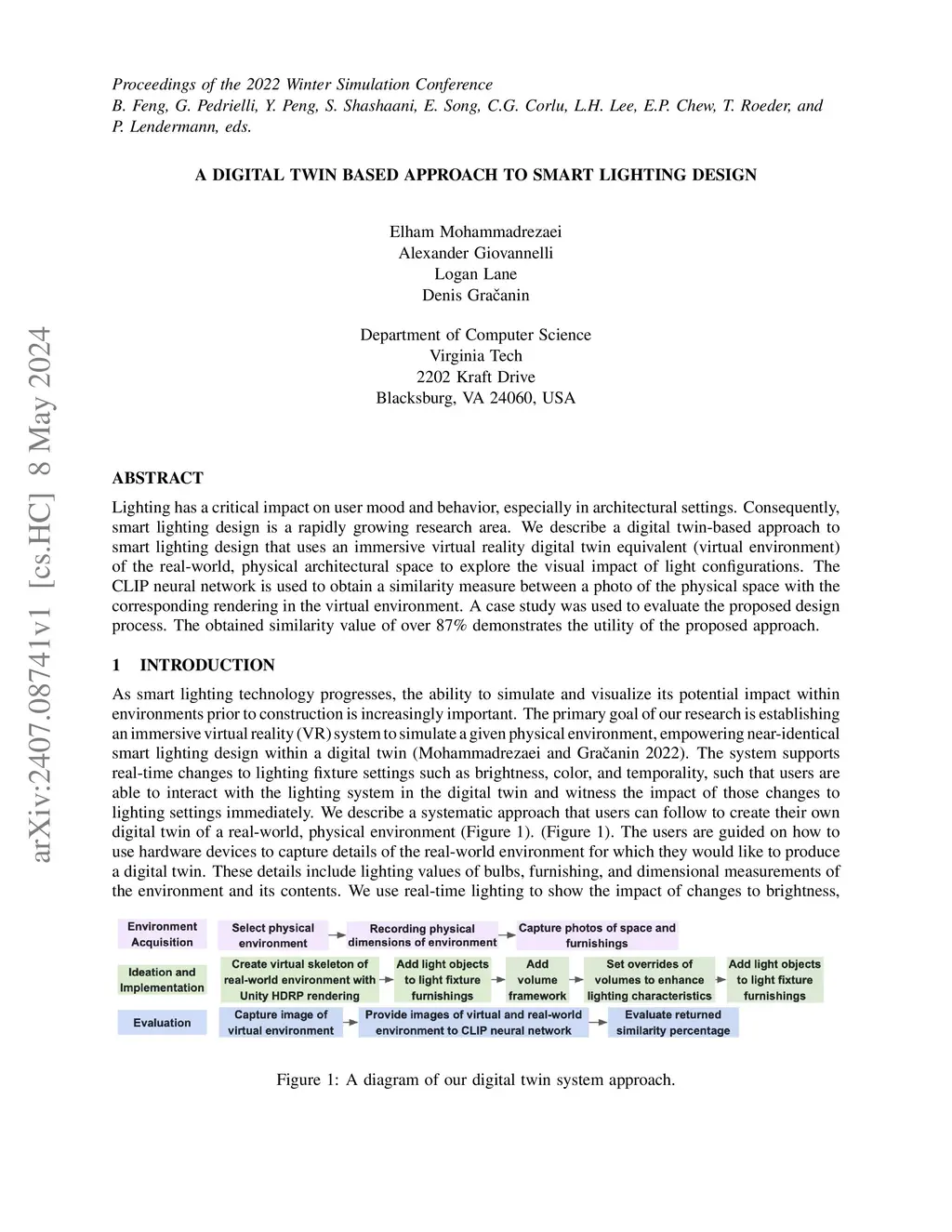 Lighting has a critical impact on user mood and behavior, especially in architectural settings. Consequently, smart lighting design is a rapidly growing research area. We describe a digital twin-based approach to smart lighting design that uses an immersive virtual reality digital twin equivalent (virtual environment) of the real world, physical architectural space to explore the visual impact of light configurations. The CLIP neural network is used to obtain a similarity measure between a photo of the physical space with the corresponding rendering in the virtual environment. A case study was used to evaluate the proposed design process. The obtained similarity value of over 87% demonstrates the utility of the proposed approach.