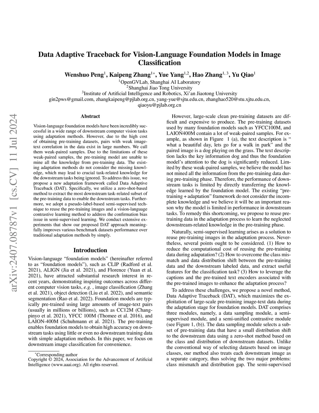 Vision-language foundation models have been incredibly successful in a wide range of downstream computer vision tasks using adaptation methods. However, due to the high cost of obtaining pre-training datasets, pairs with weak image-text correlation in the data exist in large numbers. We call them weak-paired samples. Due to the limitations of these weak-paired samples, the pre-training model are unable to mine all the knowledge from pre-training data. The existing adaptation methods do not consider the missing knowledge, which may lead to crucial task-related knowledge for the downstream tasks being ignored. To address this issue, we propose a new adaptation framework called Data Adaptive Traceback (DAT). Specifically, we utilize a zero-shot-based method to extract the most downstream task-related subset of the pre-training data to enable the downstream tasks. Furthermore, we adopt a pseudo-label-based semi-supervised technique to reuse the pre-training images and a vision-language contrastive learning method to address the confirmation bias issue in semi-supervised learning. We conduct extensive experiments that show our proposed DAT approach meaningfully improves various benchmark datasets performance over traditional adaptation methods by simply.