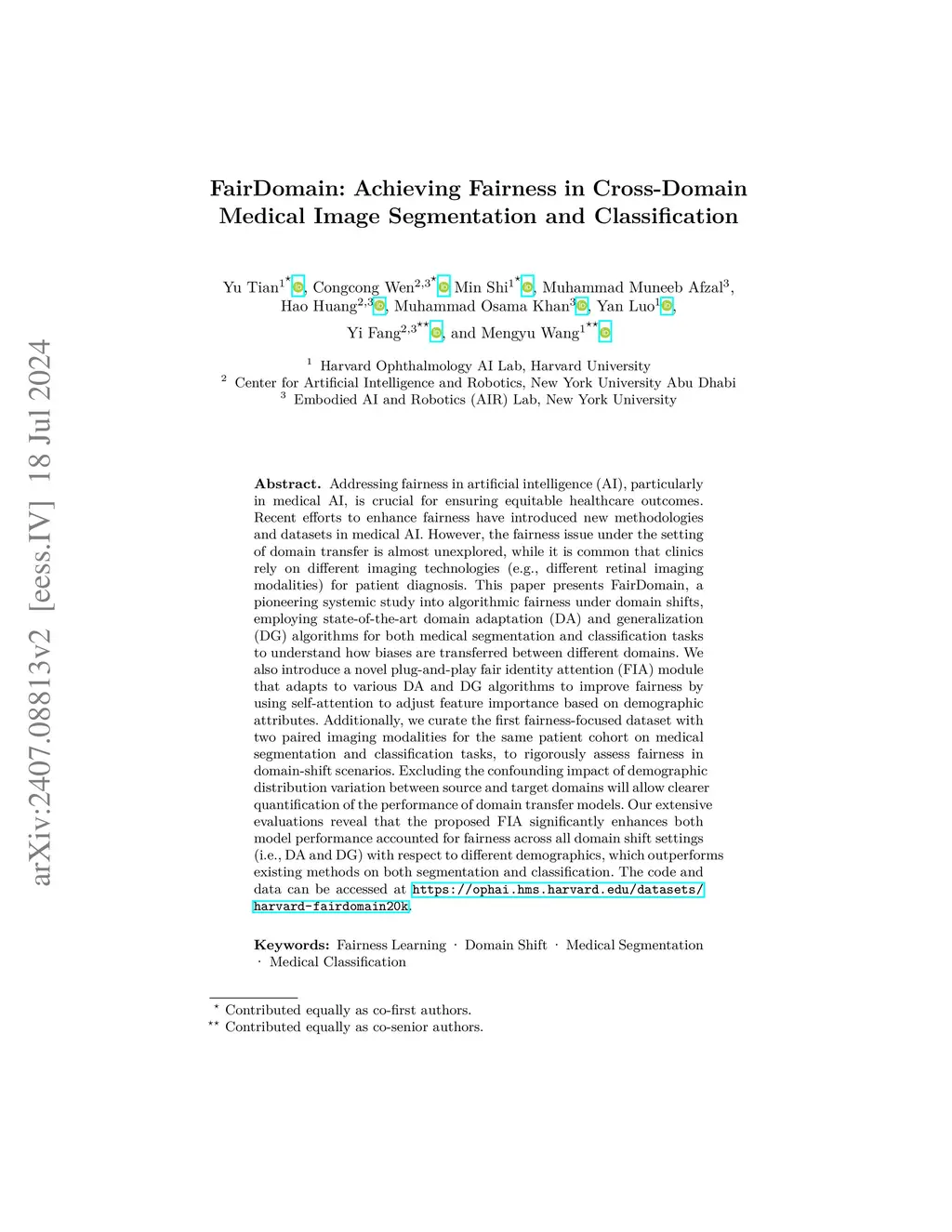 Addressing fairness in artificial intelligence (AI), particularly in medical AI, is crucial for ensuring equitable healthcare outcomes. Recent efforts to enhance fairness have introduced new methodologies and datasets in medical AI. However, the fairness issue under the setting of domain transfer is almost unexplored, while it is common that clinics rely on different imaging technologies (e.g., different retinal imaging modalities) for patient diagnosis. This paper presents FairDomain, a pioneering systemic study into algorithmic fairness under domain shifts, employing state-of-the-art domain adaptation (DA) and generalization (DG) algorithms for both medical segmentation and classification tasks to understand how biases are transferred between different domains. We also introduce a novel plug-and-play fair identity attention (FIA) module that adapts to various DA and DG algorithms to improve fairness by using self-attention to adjust feature importance based on demographic attributes. Additionally, we curate the first fairness-focused dataset with two paired imaging modalities for the same patient cohort on medical segmentation and classification tasks, to rigorously assess fairness in domain-shift scenarios. Excluding the confounding impact of demographic distribution variation between source and target domains will allow clearer quantification of the performance of domain transfer models. Our extensive evaluations reveal that the proposed FIA significantly enhances both model performance accounted for fairness across all domain shift settings (i.e., DA and DG) with respect to different demographics, which outperforms existing methods on both segmentation and classification. The code and data can be accessed at https://ophai.hms.harvard.edu/datasets/harvard-fairdomain20k.