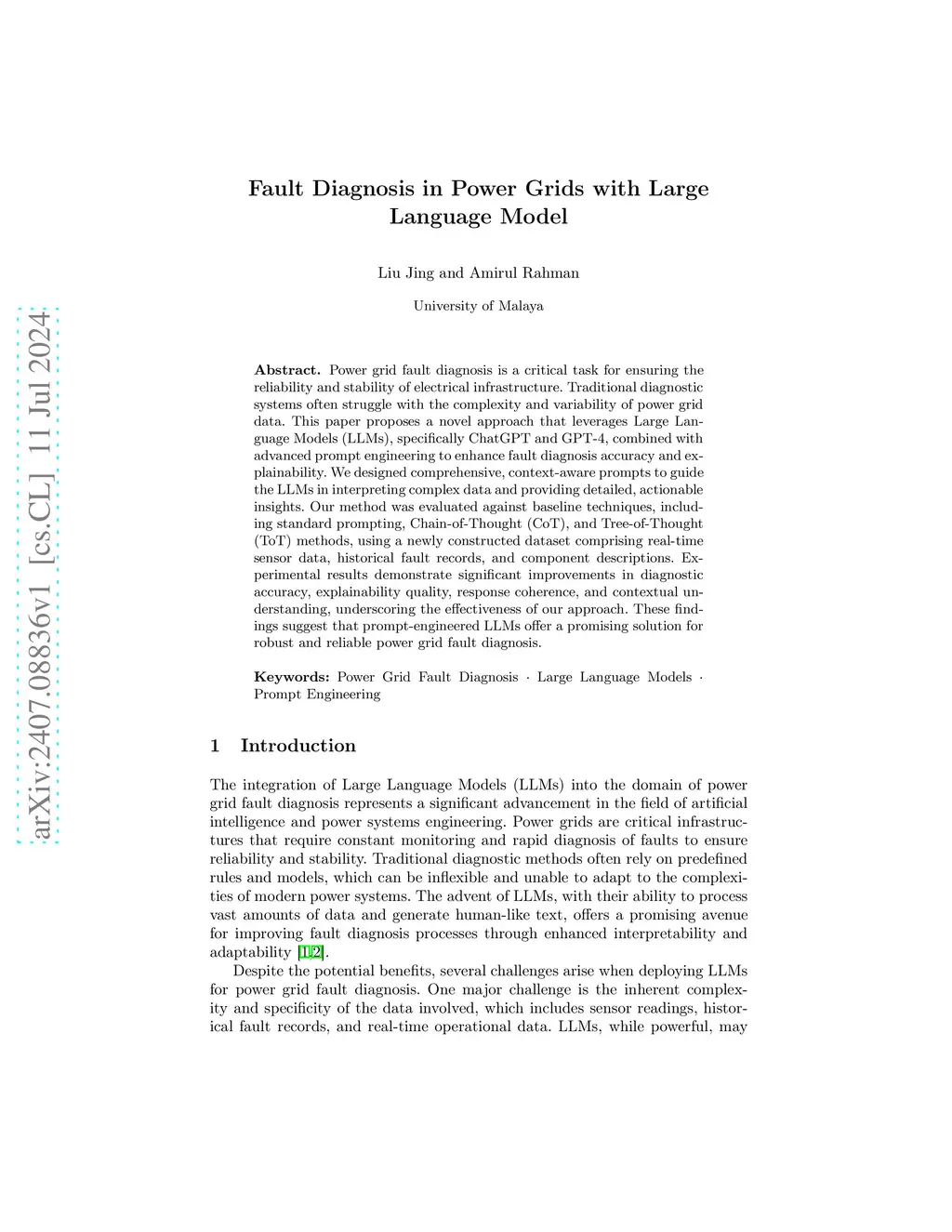 Power grid fault diagnosis is a critical task for ensuring the reliability and stability of electrical infrastructure. Traditional diagnostic systems often struggle with the complexity and variability of power grid data. This paper proposes a novel approach that leverages Large Language Models (LLMs), specifically ChatGPT and GPT-4, combined with advanced prompt engineering to enhance fault diagnosis accuracy and explainability. We designed comprehensive, context-aware prompts to guide the LLMs in interpreting complex data and providing detailed, actionable insights. Our method was evaluated against baseline techniques, including standard prompting, Chain-of-Thought (CoT), and Tree-of-Thought (ToT) methods, using a newly constructed dataset comprising real-time sensor data, historical fault records, and component descriptions. Experimental results demonstrate significant improvements in diagnostic accuracy, explainability quality, response coherence, and contextual understanding, underscoring the effectiveness of our approach. These findings suggest that prompt-engineered LLMs offer a promising solution for robust and reliable power grid fault diagnosis.