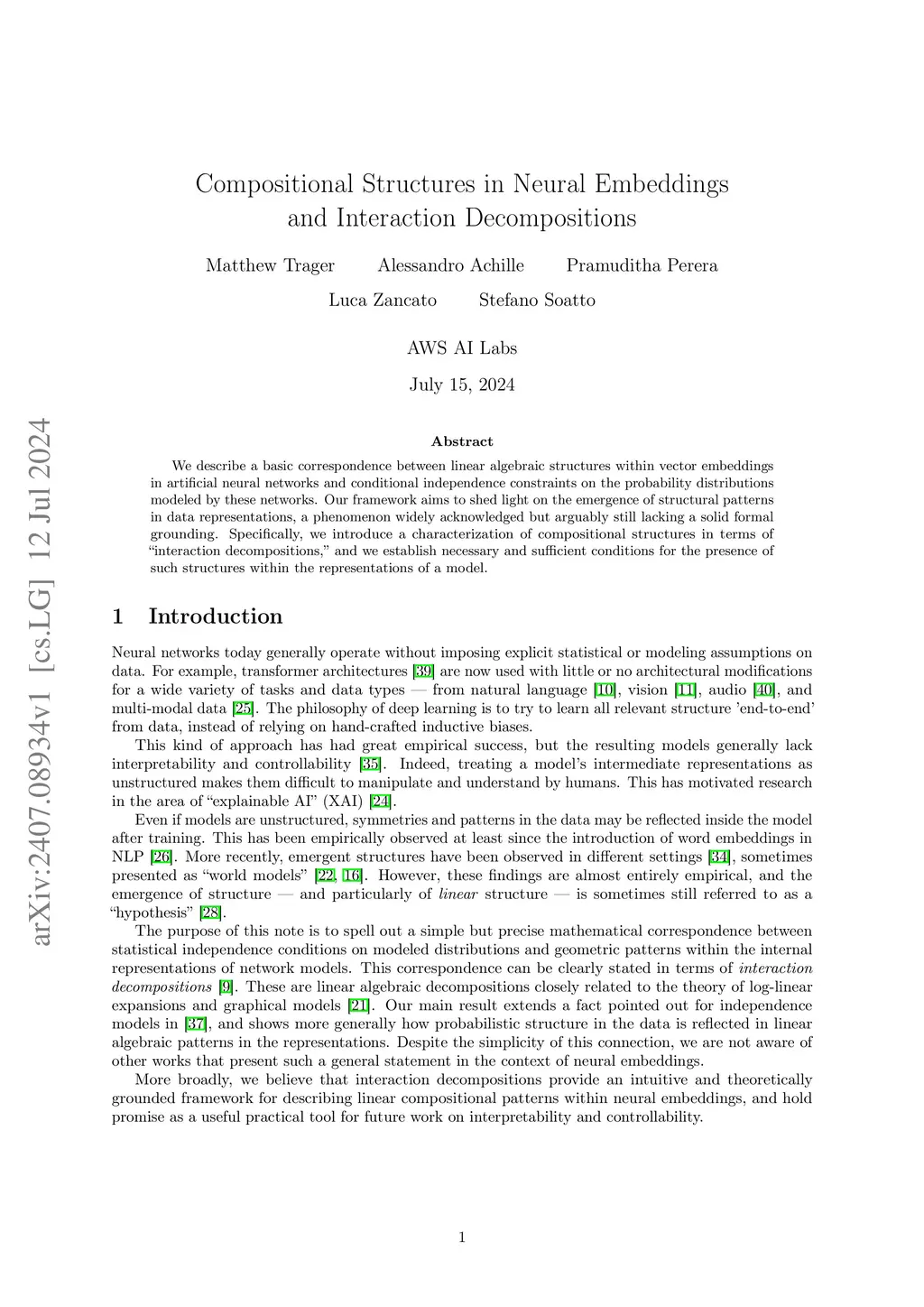 We describe a basic correspondence between linear algebraic structures within vector embeddings in artificial neural networks and conditional independence constraints on the probability distributions modeled by these networks. Our framework aims to shed light on the emergence of structural patterns in data representations, a phenomenon widely acknowledged but arguably still lacking a solid formal grounding. Specifically, we introduce a characterization of compositional structures in terms of "interaction decompositions," and we establish necessary and sufficient conditions for the presence of such structures within the representations of a model.