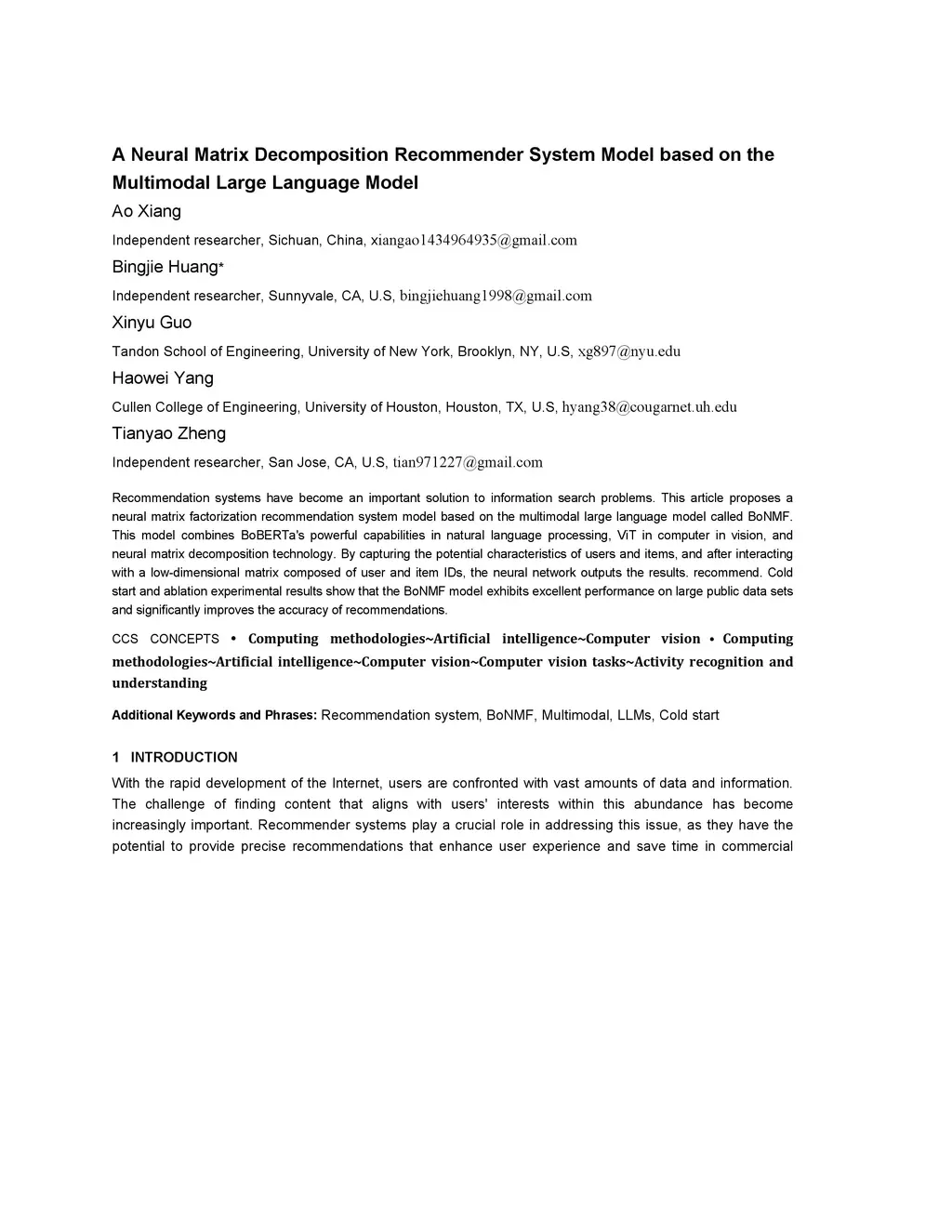 Recommendation systems have become an important solution to information search problems. This article proposes a neural matrix factorization recommendation system model based on the multimodal large language model called BoNMF. This model combines BoBERTa's powerful capabilities in natural language processing, ViT in computer in vision, and neural matrix decomposition technology. By capturing the potential characteristics of users and items, and after interacting with a low-dimensional matrix composed of user and item IDs, the neural network outputs the results. recommend. Cold start and ablation experimental results show that the BoNMF model exhibits excellent performance on large public data sets and significantly improves the accuracy of recommendations.