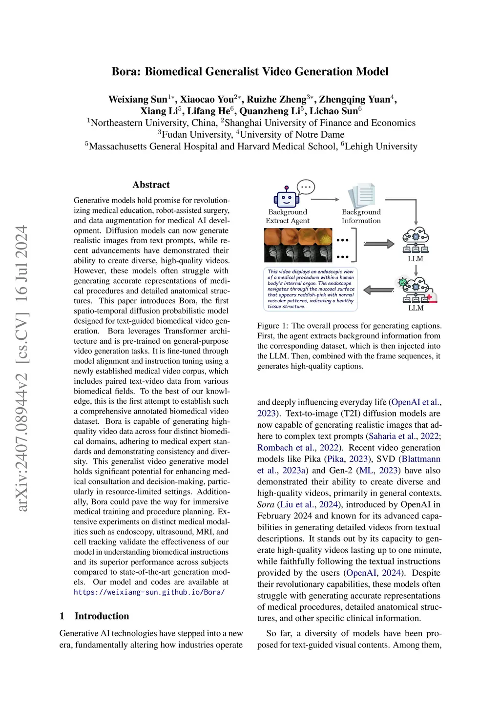 Generative models hold promise for revolutionizing medical education, robot-assisted surgery, and data augmentation for medical AI development. Diffusion models can now generate realistic images from text prompts, while recent advancements have demonstrated their ability to create diverse, high-quality videos. However, these models often struggle with generating accurate representations of medical procedures and detailed anatomical structures. This paper introduces Bora, the first spatio-temporal diffusion probabilistic model designed for text-guided biomedical video generation. Bora leverages Transformer architecture and is pre-trained on general-purpose video generation tasks. It is fine-tuned through model alignment and instruction tuning using a newly established medical video corpus, which includes paired text-video data from various biomedical fields. To the best of our knowledge, this is the first attempt to establish such a comprehensive annotated biomedical video dataset. Bora is capable of generating high-quality video data across four distinct biomedical domains, adhering to medical expert standards and demonstrating consistency and diversity. This generalist video generative model holds significant potential for enhancing medical consultation and decision-making, particularly in resource-limited settings. Additionally, Bora could pave the way for immersive medical training and procedure planning. Extensive experiments on distinct medical modalities such as endoscopy, ultrasound, MRI, and cell tracking validate the effectiveness of our model in understanding biomedical instructions and its superior performance across subjects compared to state-of-the-art generation models.
