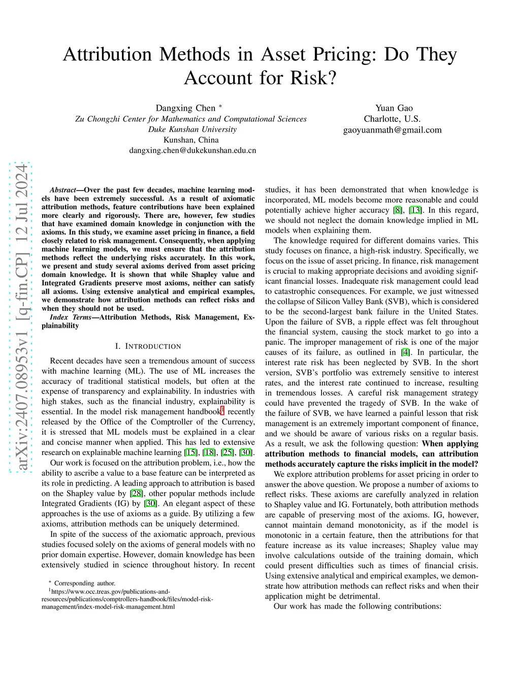 Over the past few decades, machine learning models have been extremely successful. As a result of axiomatic attribution methods, feature contributions have been explained more clearly and rigorously. There are, however, few studies that have examined domain knowledge in conjunction with the axioms. In this study, we examine asset pricing in finance, a field closely related to risk management. Consequently, when applying machine learning models, we must ensure that the attribution methods reflect the underlying risks accurately. In this work, we present and study several axioms derived from asset pricing domain knowledge. It is shown that while Shapley value and Integrated Gradients preserve most axioms, neither can satisfy all axioms. Using extensive analytical and empirical examples, we demonstrate how attribution methods can reflect risks and when they should not be used.