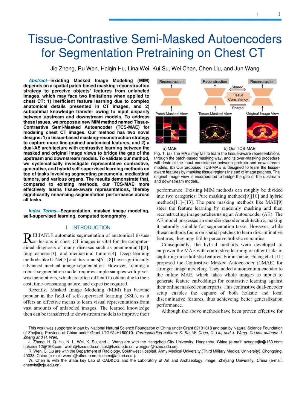 Existing Masked Image Modeling (MIM) depends on a spatial patch-based masking-reconstruction strategy to perceive objects'features from unlabeled images, which may face two limitations when applied to chest CT: 1) inefficient feature learning due to complex anatomical details presented in CT images, and 2) suboptimal knowledge transfer owing to input disparity between upstream and downstream models. To address these issues, we propose a new MIM method named Tissue-Contrastive Semi-Masked Autoencoder (TCS-MAE) for modeling chest CT images. Our method has two novel designs: 1) a tissue-based masking-reconstruction strategy to capture more fine-grained anatomical features, and 2) a dual-AE architecture with contrastive learning between the masked and original image views to bridge the gap of the upstream and downstream models. To validate our method, we systematically investigate representative contrastive, generative, and hybrid self-supervised learning methods on top of tasks involving segmenting pneumonia, mediastinal tumors, and various organs. The results demonstrate that, compared to existing methods, our TCS-MAE more effectively learns tissue-aware representations, thereby significantly enhancing segmentation performance across all tasks.