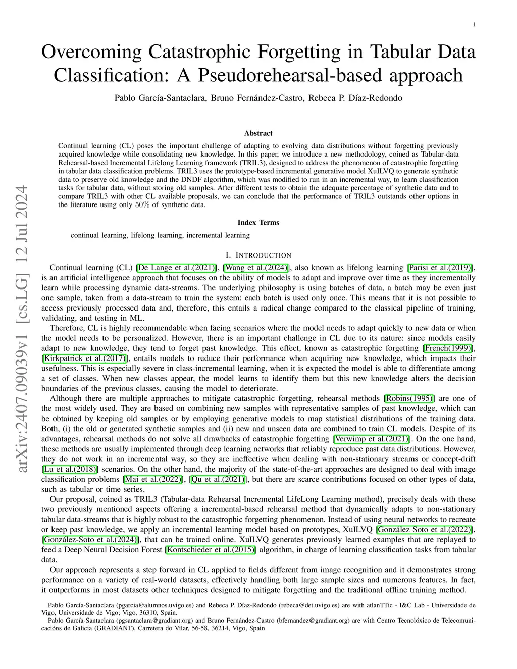 Continual learning (CL) poses the important challenge of adapting to evolving data distributions without forgetting previously acquired knowledge while consolidating new knowledge. In this paper, we introduce a new methodology, coined as Tabular-data Rehearsal-based Incremental Lifelong Learning framework (TRIL3), designed to address the phenomenon of catastrophic forgetting in tabular data classification problems. TRIL3 uses the prototype-based incremental generative model XuILVQ to generate synthetic data to preserve old knowledge and the DNDF algorithm, which was modified to run in an incremental way, to learn classification tasks for tabular data, without storing old samples. After different tests to obtain the adequate percentage of synthetic data and to compare TRIL3 with other CL available proposals, we can conclude that the performance of TRIL3 outstands other options in the literature using only 50% of synthetic data.