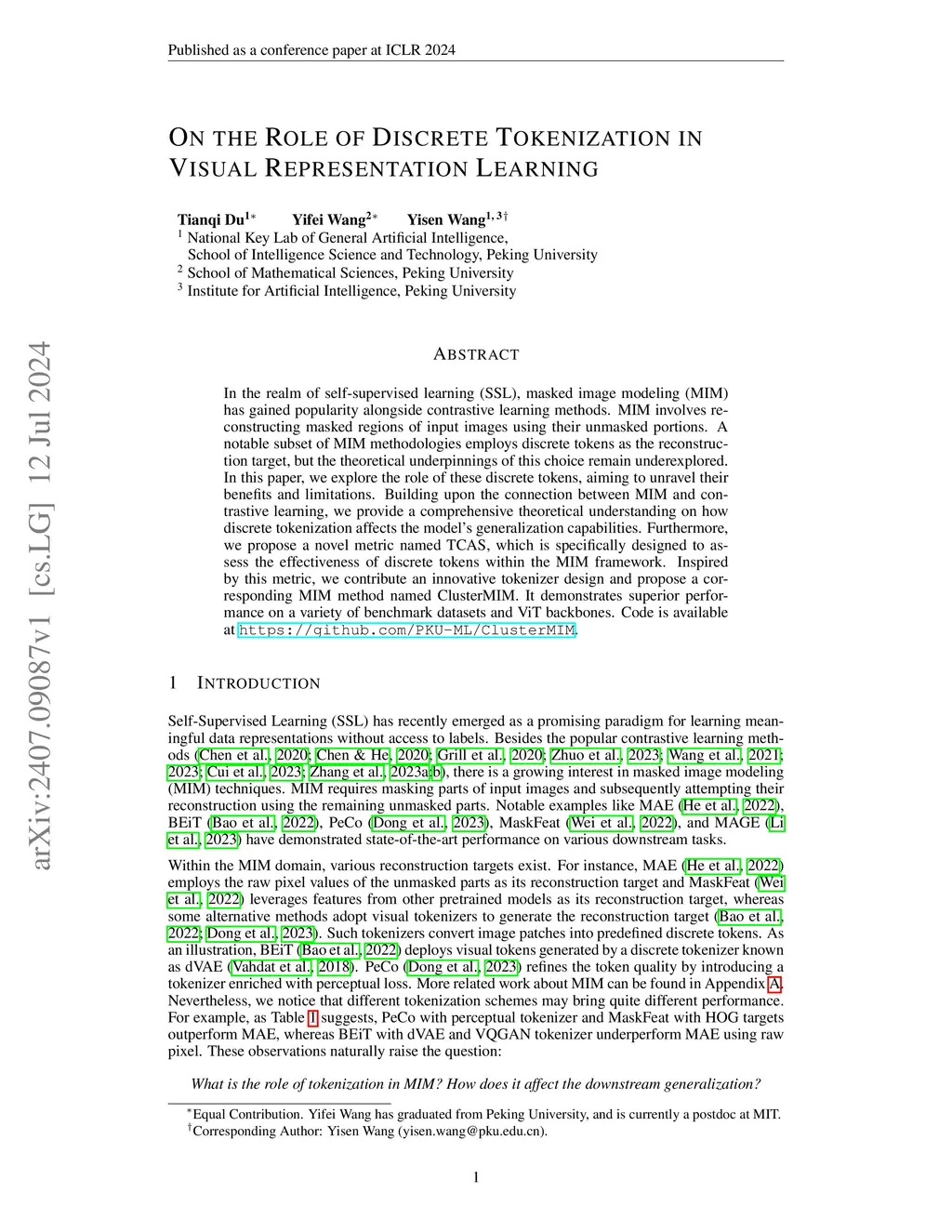 In the realm of self-supervised learning (SSL), masked image modeling (MIM) has gained popularity alongside contrastive learning methods. MIM involves reconstructing masked regions of input images using their unmasked portions. A notable subset of MIM methodologies employs discrete tokens as the reconstruction target, but the theoretical underpinnings of this choice remain underexplored. In this paper, we explore the role of these discrete tokens, aiming to unravel their benefits and limitations. Building upon the connection between MIM and contrastive learning, we provide a comprehensive theoretical understanding on how discrete tokenization affects the model's generalization capabilities. Furthermore, we propose a novel metric named TCAS, which is specifically designed to assess the effectiveness of discrete tokens within the MIM framework. Inspired by this metric, we contribute an innovative tokenizer design and propose a corresponding MIM method named ClusterMIM. It demonstrates superior performance on a variety of benchmark datasets and ViT backbones. Code is available at https://github.com/PKU-ML/ClusterMIM.