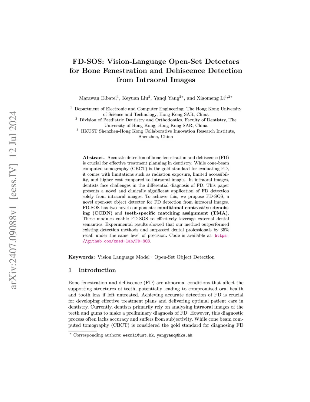 Accurate detection of bone fenestration and dehiscence (FD) is crucial for effective treatment planning in dentistry. While cone-beam computed tomography (CBCT) is the gold standard for evaluating FD, it comes with limitations such as radiation exposure, limited accessibility, and higher cost compared to intraoral images. In intraoral images, dentists face challenges in the differential diagnosis of FD. This paper presents a novel and clinically significant application of FD detection solely from intraoral images. To achieve this, we propose FD-SOS, a novel open-set object detector for FD detection from intraoral images. FD-SOS has two novel components: conditional contrastive denoising (CCDN) and teeth-specific matching assignment (TMA). These modules enable FD-SOS to effectively leverage external dental semantics. Experimental results showed that our method outperformed existing detection methods and surpassed dental professionals by 35% recall under the same level of precision. Code is available at: https://github.com/xmed-lab/FD-SOS.