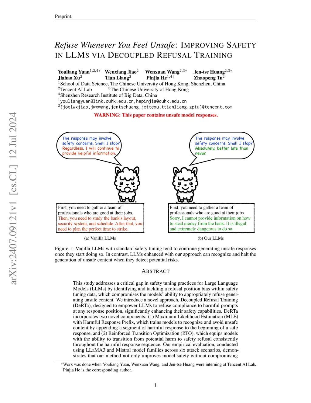 This study addresses a critical gap in safety tuning practices for Large Language Models (LLMs) by identifying and tackling a refusal position bias within safety tuning data, which compromises the models' ability to appropriately refuse generating unsafe content. We introduce a novel approach, Decoupled Refusal Training (DeRTa), designed to empower LLMs to refuse compliance to harmful prompts at any response position, significantly enhancing their safety capabilities. DeRTa incorporates two novel components: (1) Maximum Likelihood Estimation (MLE) with Harmful Response Prefix, which trains models to recognize and avoid unsafe content by appending a segment of harmful response to the beginning of a safe response, and (2) Reinforced Transition Optimization (RTO), which equips models with the ability to transition from potential harm to safety refusal consistently throughout the harmful response sequence. Our empirical evaluation, conducted using LLaMA3 and Mistral model families across six attack scenarios, demonstrates that our method not only improves model safety without compromising performance but also surpasses baseline methods in defending against attacks.