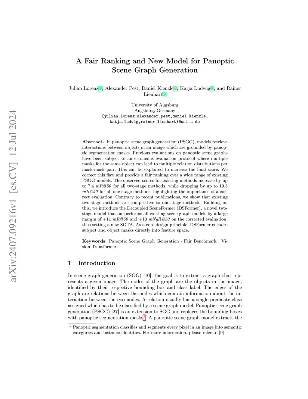 In panoptic scene graph generation (PSGG), models retrieve interactions between objects in an image which are grounded by panoptic segmentation masks. Previous evaluations on panoptic scene graphs have been subject to an erroneous evaluation protocol where multiple masks for the same object can lead to multiple relation distributions per mask-mask pair. This can be exploited to increase the final score. We correct this flaw and provide a fair ranking over a wide range of existing PSGG models. The observed scores for existing methods increase by up to 7.4 mR@50 for all two-stage methods, while dropping by up to 19.3 mR@50 for all one-stage methods, highlighting the importance of a correct evaluation. Contrary to recent publications, we show that existing two-stage methods are competitive to one-stage methods. Building on this, we introduce the Decoupled SceneFormer (DSFormer), a novel two-stage model that outperforms all existing scene graph models by a large margin of +11 mR@50 and +10 mNgR@50 on the corrected evaluation, thus setting a new SOTA. As a core design principle, DSFormer encodes subject and object masks directly into feature space.