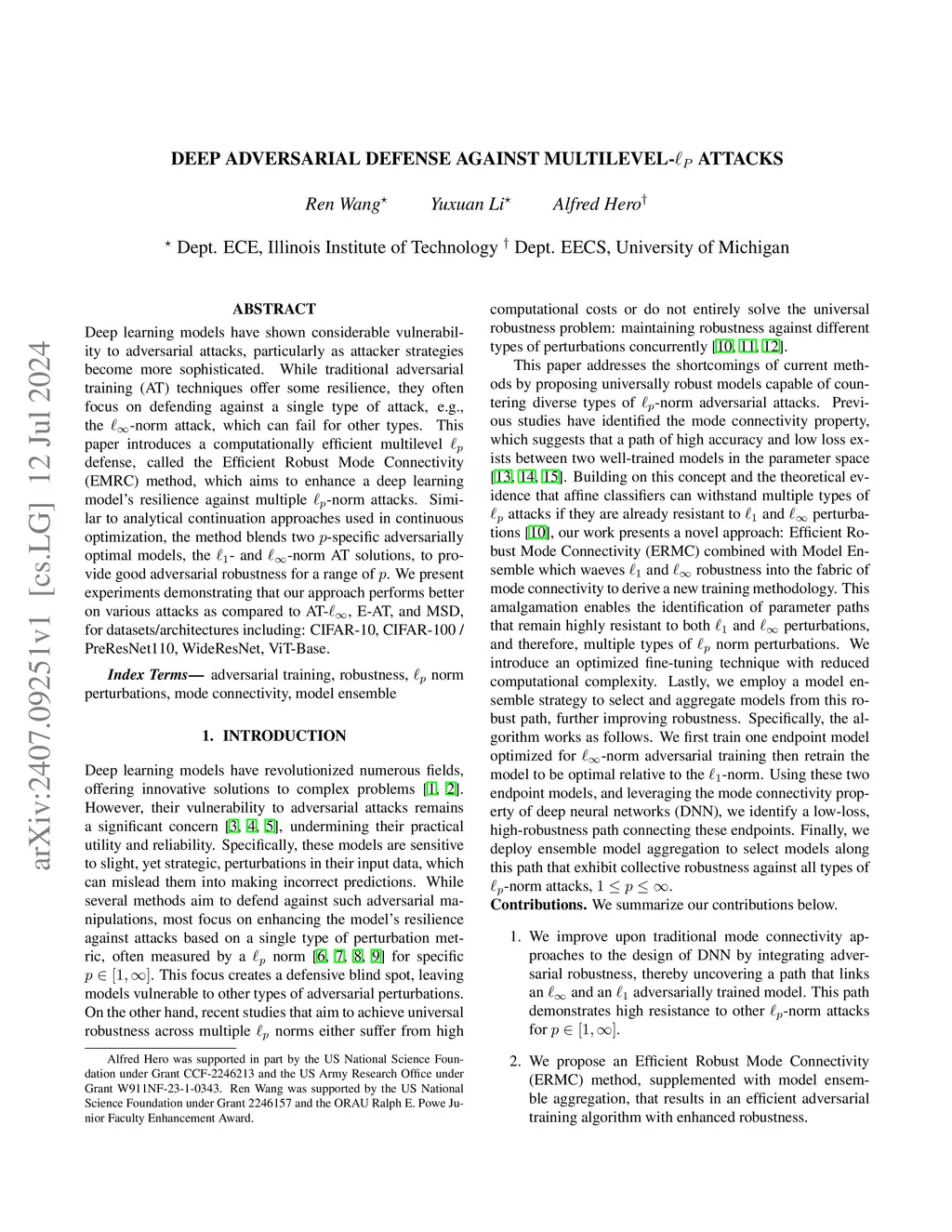 Deep learning models have shown considerable vulnerability to adversarial attacks, particularly as attacker strategies become more sophisticated. While traditional adversarial training (AT) techniques offer some resilience, they often focus on defending against a single type of attack, e.g., the -norm attack, which can fail for other types. This paper introduces a computationally efficient multilevel defense, called the Efficient Robust Mode Connectivity (EMRC) method, which aims to enhance a deep learning model's resilience against multiple -norm attacks. Similar to analytical continuation approaches used in continuous optimization, the method blends two -specific adversarially optimal models, the - and -norm AT solutions, to provide good adversarial robustness for a range of . We present experiments demonstrating that our approach performs better on various attacks as compared to AT-, E-AT, and MSD, for datasets/architectures including: CIFAR-10, CIFAR-100 / PreResNet110, WideResNet, ViT-Base.