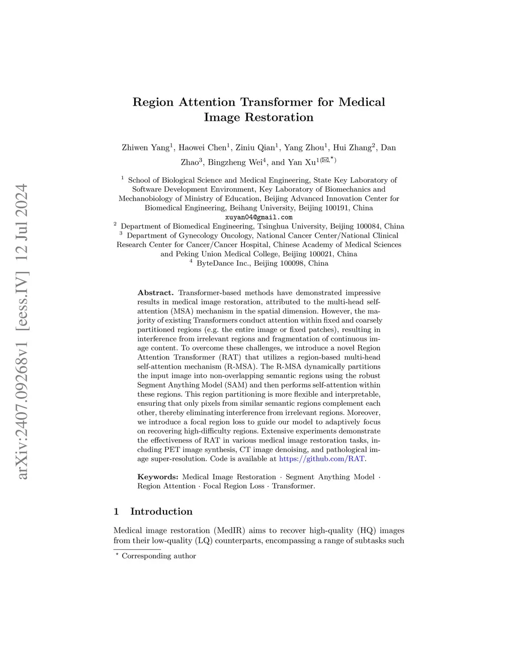 Transformer-based methods have demonstrated impressive results in medical image restoration, attributed to the multi-head self-attention (MSA) mechanism in the spatial dimension. However, the majority of existing Transformers conduct attention within fixed and coarsely partitioned regions (\text{e.g.} the entire image or fixed patches), resulting in interference from irrelevant regions and fragmentation of continuous image content. To overcome these challenges, we introduce a novel Region Attention Transformer (RAT) that utilizes a region-based multi-head self-attention mechanism (R-MSA). The R-MSA dynamically partitions the input image into non-overlapping semantic regions using the robust Segment Anything Model (SAM) and then performs self-attention within these regions. This region partitioning is more flexible and interpretable, ensuring that only pixels from similar semantic regions complement each other, thereby eliminating interference from irrelevant regions. Moreover, we introduce a focal region loss to guide our model to adaptively focus on recovering high-difficulty regions. Extensive experiments demonstrate the effectiveness of RAT in various medical image restoration tasks, including PET image synthesis, CT image denoising, and pathological image super-resolution. Code is available at \href{https://github.com/Yaziwel/Region-Attention-Transformer-for-Medical-Image-Restoration.git}{https://github.com/RAT}.