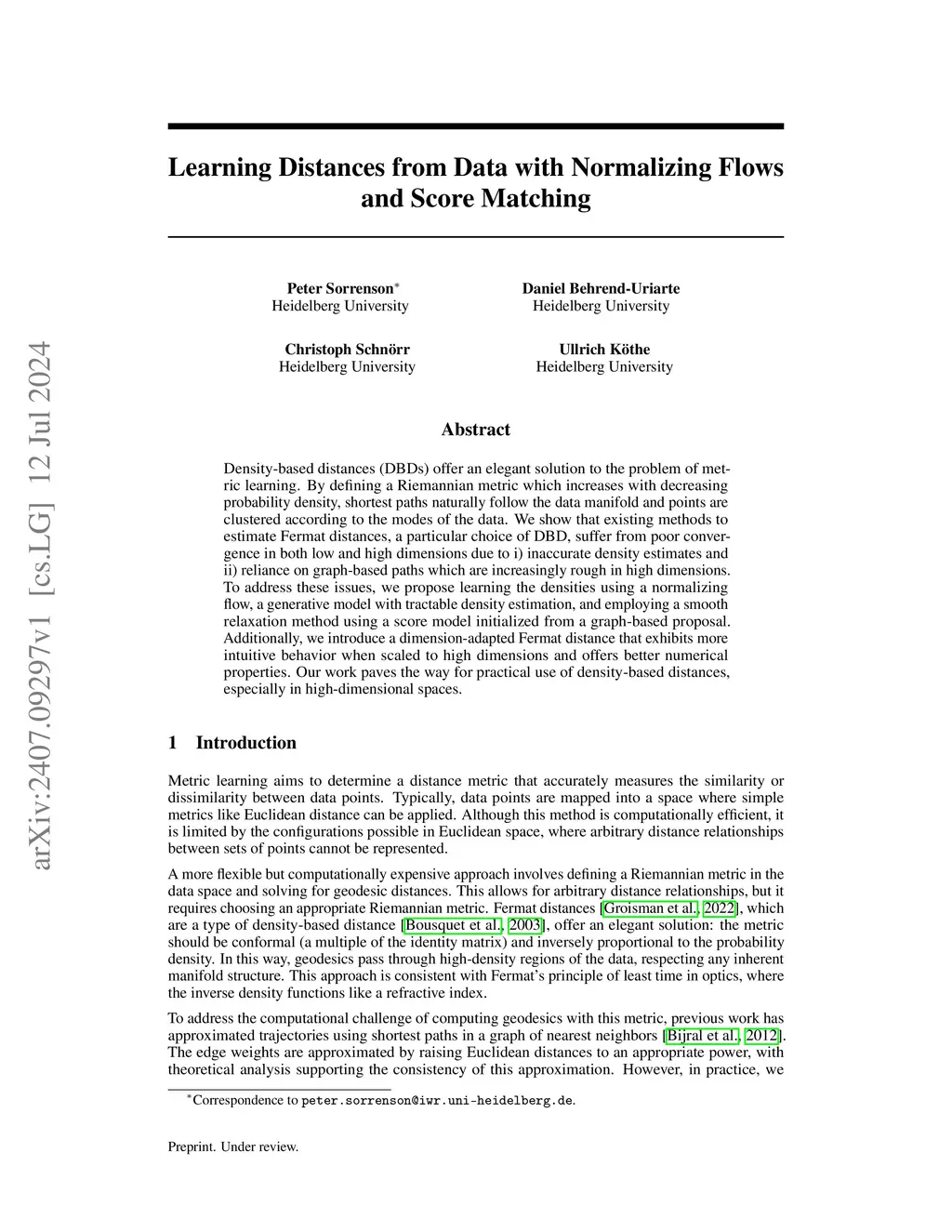 Density-based distances (DBDs) offer an elegant solution to the problem of metric learning. By defining a Riemannian metric which increases with decreasing probability density, shortest paths naturally follow the data manifold and points are clustered according to the modes of the data. We show that existing methods to estimate Fermat distances, a particular choice of DBD, suffer from poor convergence in both low and high dimensions due to i) inaccurate density estimates and ii) reliance on graph-based paths which are increasingly rough in high dimensions. To address these issues, we propose learning the densities using a normalizing flow, a generative model with tractable density estimation, and employing a smooth relaxation method using a score model initialized from a graph-based proposal. Additionally, we introduce a dimension-adapted Fermat distance that exhibits more intuitive behavior when scaled to high dimensions and offers better numerical properties. Our work paves the way for practical use of density-based distances, especially in high-dimensional spaces.
