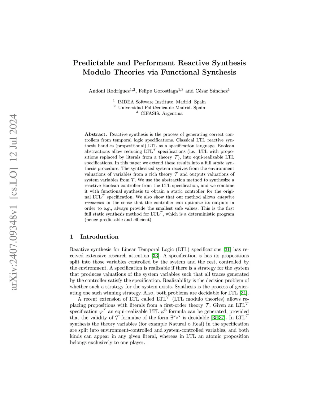 Reactive synthesis is the process of generating correct controllers from temporal logic specifications. Classical LTL reactive synthesis handles (propositional) LTL as a specification language. Boolean abstractions allow reducing LTLt specifications (i.e., LTL with propositions replaced by literals from a theory calT), into equi-realizable LTL specifications. In this paper we extend these results into a full static synthesis procedure. The synthesized system receives from the environment valuations of variables from a rich theory calT and outputs valuations of system variables from calT. We use the abstraction method to synthesize a reactive Boolean controller from the LTL specification, and we combine it with functional synthesis to obtain a static controller for the original LTLt specification. We also show that our method allows responses in the sense that the controller can optimize its outputs in order to e.g., always provide the smallest safe values. This is the first full static synthesis method for LTLt, which is a deterministic program (hence predictable and efficient).