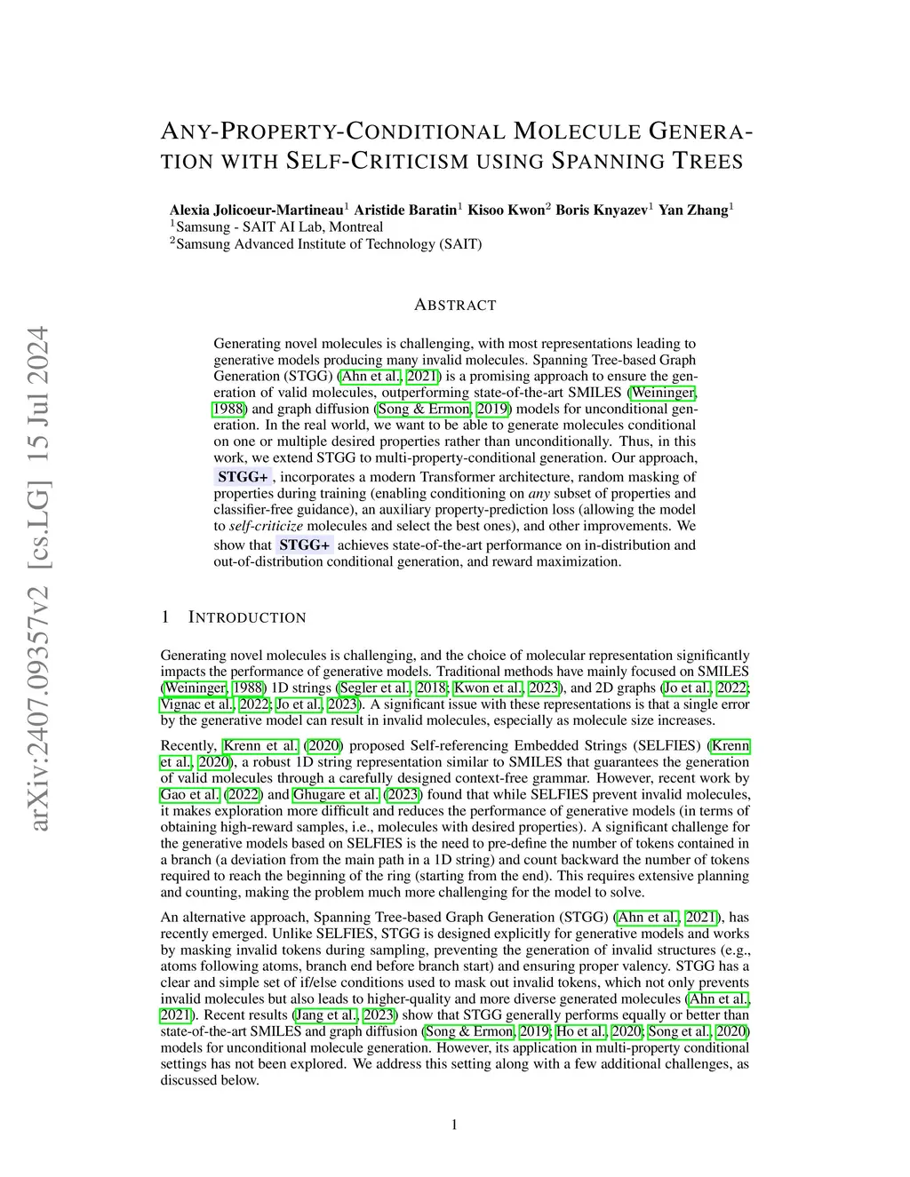 Generating novel molecules is challenging, with most representations leading to generative models producing many invalid molecules. Spanning Tree-based Graph Generation (STGG) is a promising approach to ensure the generation of valid molecules, outperforming state-of-the-art SMILES and graph diffusion models for unconditional generation. In the real world, we want to be able to generate molecules conditional on one or multiple desired properties rather than unconditionally. Thus, in this work, we extend STGG to multi-property-conditional generation. Our approach, STGG+, incorporates a modern Transformer architecture, random masking of properties during training (enabling conditioning on any subset of properties and classifier-free guidance), an auxiliary property-prediction loss (allowing the model to self-criticize molecules and select the best ones), and other improvements. We show that STGG+ achieves state-of-the-art performance on in-distribution and out-of-distribution conditional generation, and reward maximization.