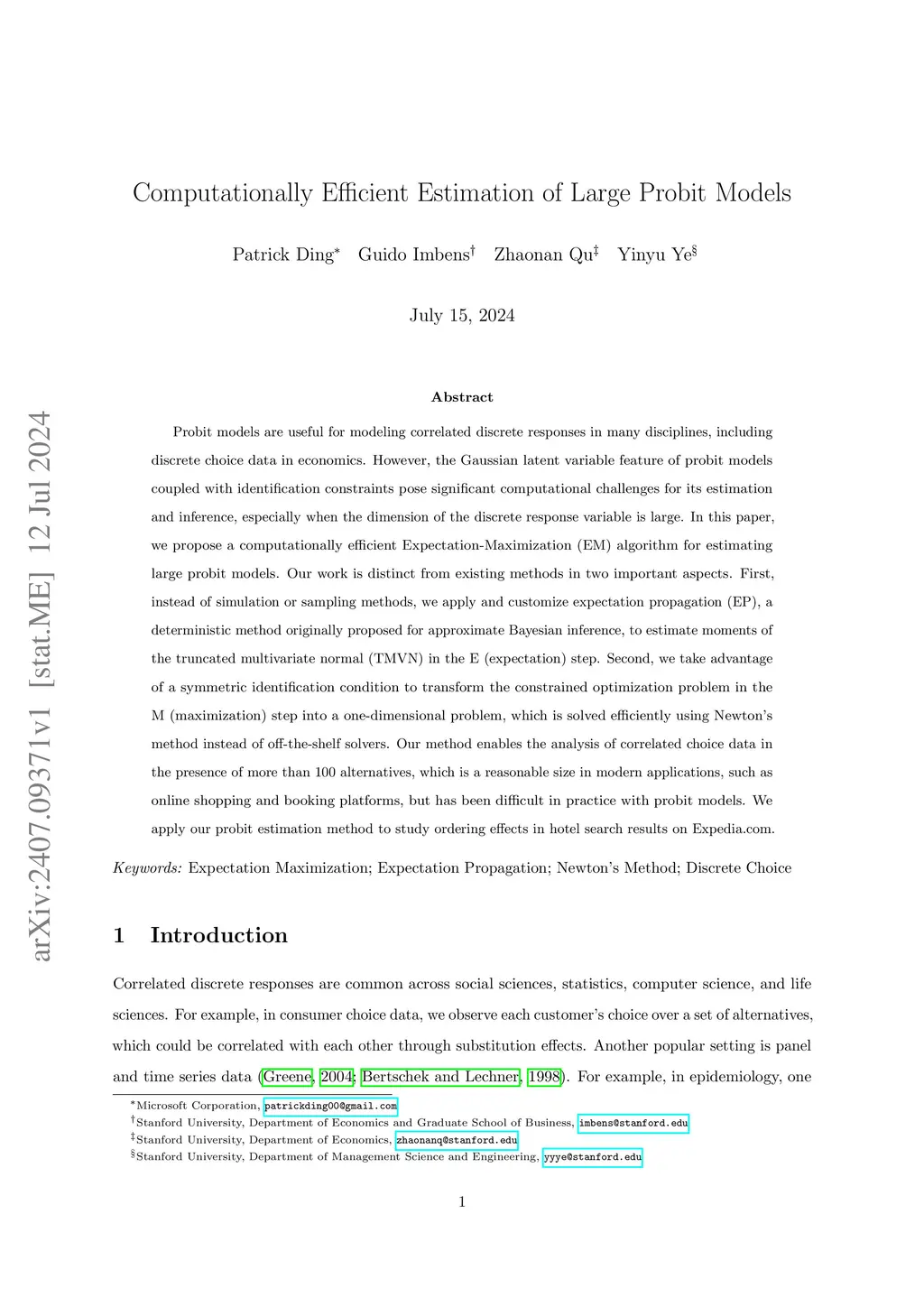 Probit models are useful for modeling correlated discrete responses in many disciplines, including discrete choice data in economics. However, the Gaussian latent variable feature of probit models coupled with identification constraints pose significant computational challenges for its estimation and inference, especially when the dimension of the discrete response variable is large. In this paper, we propose a computationally efficient Expectation-Maximization (EM) algorithm for estimating large probit models. Our work is distinct from existing methods in two important aspects. First, instead of simulation or sampling methods, we apply and customize expectation propagation (EP), a deterministic method originally proposed for approximate Bayesian inference, to estimate moments of the truncated multivariate normal (TMVN) in the E (expectation) step. Second, we take advantage of a symmetric identification condition to transform the constrained optimization problem in the M (maximization) step into a one-dimensional problem, which is solved efficiently using Newton's method instead of off-the-shelf solvers. Our method enables the analysis of correlated choice data in the presence of more than 100 alternatives, which is a reasonable size in modern applications, such as online shopping and booking platforms, but has been difficult in practice with probit models. We apply our probit estimation method to study ordering effects in hotel search results on Expedia.com.