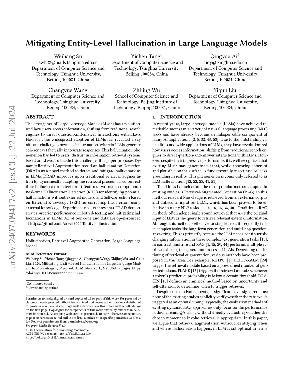 The emergence of Large Language Models (LLMs) has revolutionized how users access information, shifting from traditional search engines to direct question-and-answer interactions with LLMs. However, the widespread adoption of LLMs has revealed a significant challenge known as hallucination, wherein LLMs generate coherent yet factually inaccurate responses. This hallucination phenomenon has led to users' distrust in information retrieval systems based on LLMs. To tackle this challenge, this paper proposes Dynamic Retrieval Augmentation based on hallucination Detection (DRAD) as a novel method to detect and mitigate hallucinations in LLMs. DRAD improves upon traditional retrieval augmentation by dynamically adapting the retrieval process based on real-time hallucination detection. It features two main components: Real-time Hallucination Detection (RHD) for identifying potential hallucinations without external models, and Self-correction based on External Knowledge (SEK) for correcting these errors using external knowledge. Experiment results show that DRAD demonstrates superior performance in both detecting and mitigating hallucinations in LLMs. All of our code and data are open-sourced at https://github.com/oneal2000/EntityHallucination.