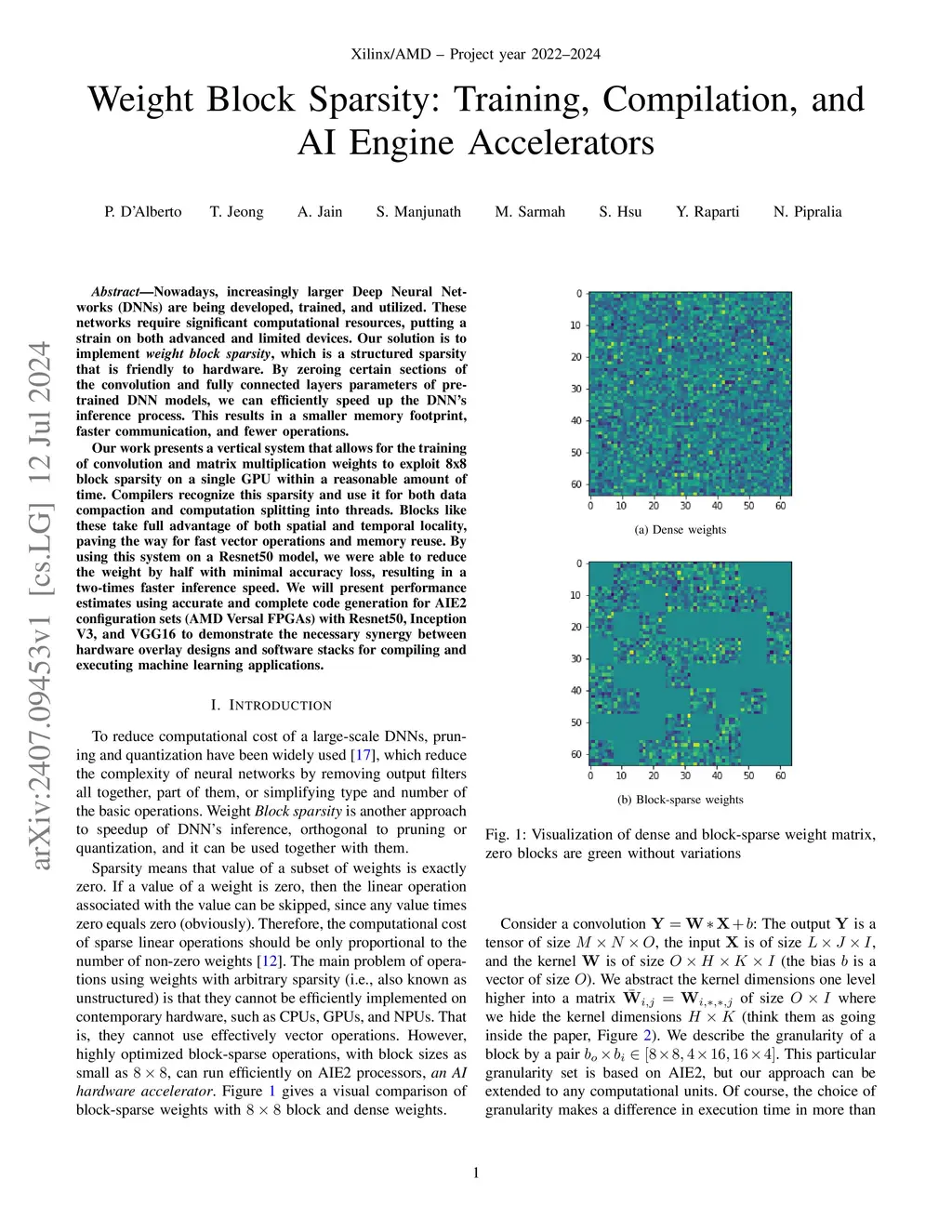 Nowadays, increasingly larger Deep Neural Networks (DNNs) are being developed, trained, and utilized. These networks require significant computational resources, putting a strain on both advanced and limited devices. Our solution is to implement {\em weight block sparsity}, which is a structured sparsity that is friendly to hardware. By zeroing certain sections of the convolution and fully connected layers parameters of pre-trained DNN models, we can efficiently speed up the DNN's inference process. This results in a smaller memory footprint, faster communication, and fewer operations. Our work presents a vertical system that allows for the training of convolution and matrix multiplication weights to exploit 8x8 block sparsity on a single GPU within a reasonable amount of time. Compilers recognize this sparsity and use it for both data compaction and computation splitting into threads. Blocks like these take full advantage of both spatial and temporal locality, paving the way for fast vector operations and memory reuse. By using this system on a Resnet50 model, we were able to reduce the weight by half with minimal accuracy loss, resulting in a two-times faster inference speed. We will present performance estimates using accurate and complete code generation for AIE2 configuration sets (AMD Versal FPGAs) with Resnet50, Inception V3, and VGG16 to demonstrate the necessary synergy between hardware overlay designs and software stacks for compiling and executing machine learning applications.