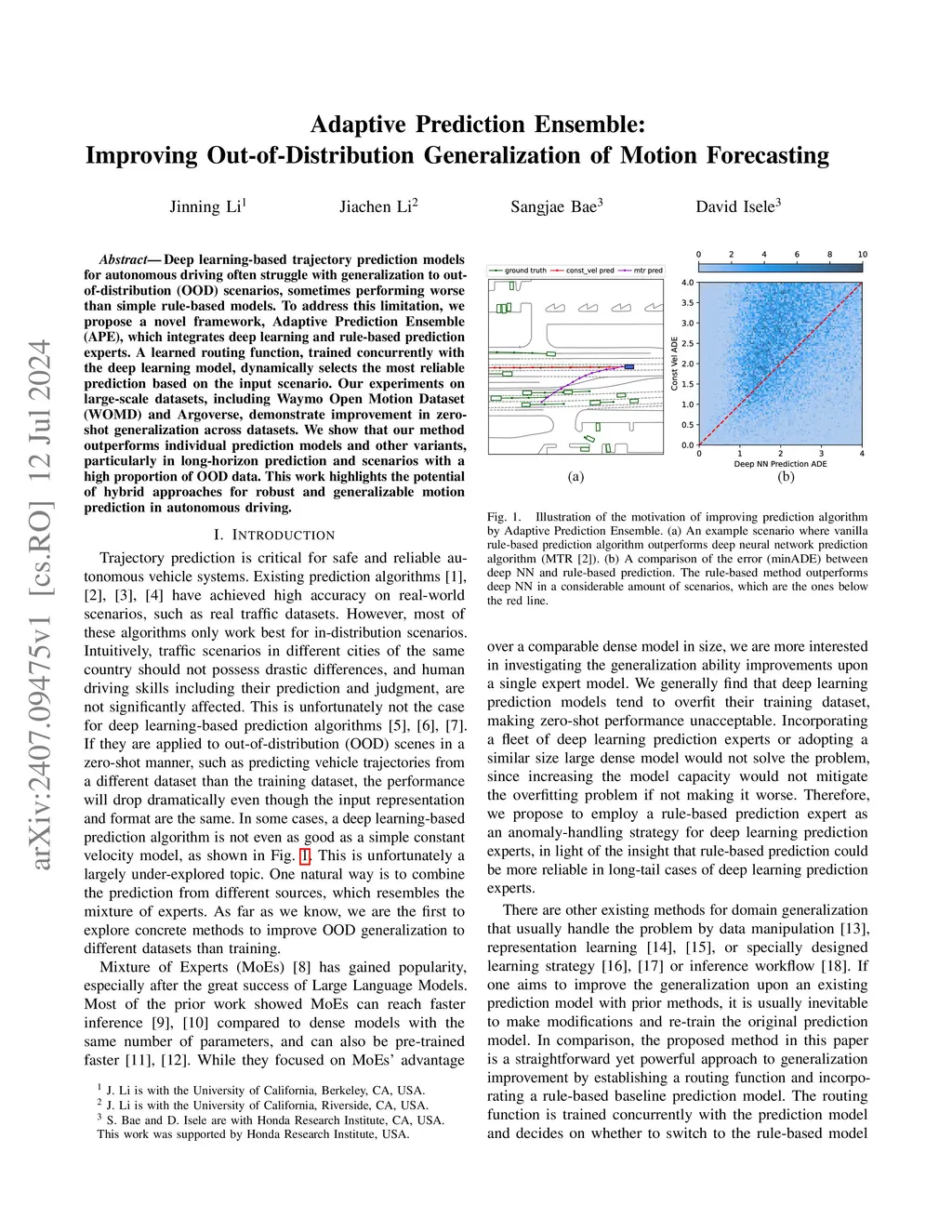 Deep learning-based trajectory prediction models for autonomous driving often struggle with generalization to out-of-distribution (OOD) scenarios, sometimes performing worse than simple rule-based models. To address this limitation, we propose a novel framework, Adaptive Prediction Ensemble (APE), which integrates deep learning and rule-based prediction experts. A learned routing function, trained concurrently with the deep learning model, dynamically selects the most reliable prediction based on the input scenario. Our experiments on large-scale datasets, including Waymo Open Motion Dataset (WOMD) and Argoverse, demonstrate improvement in zero-shot generalization across datasets. We show that our method outperforms individual prediction models and other variants, particularly in long-horizon prediction and scenarios with a high proportion of OOD data. This work highlights the potential of hybrid approaches for robust and generalizable motion prediction in autonomous driving.