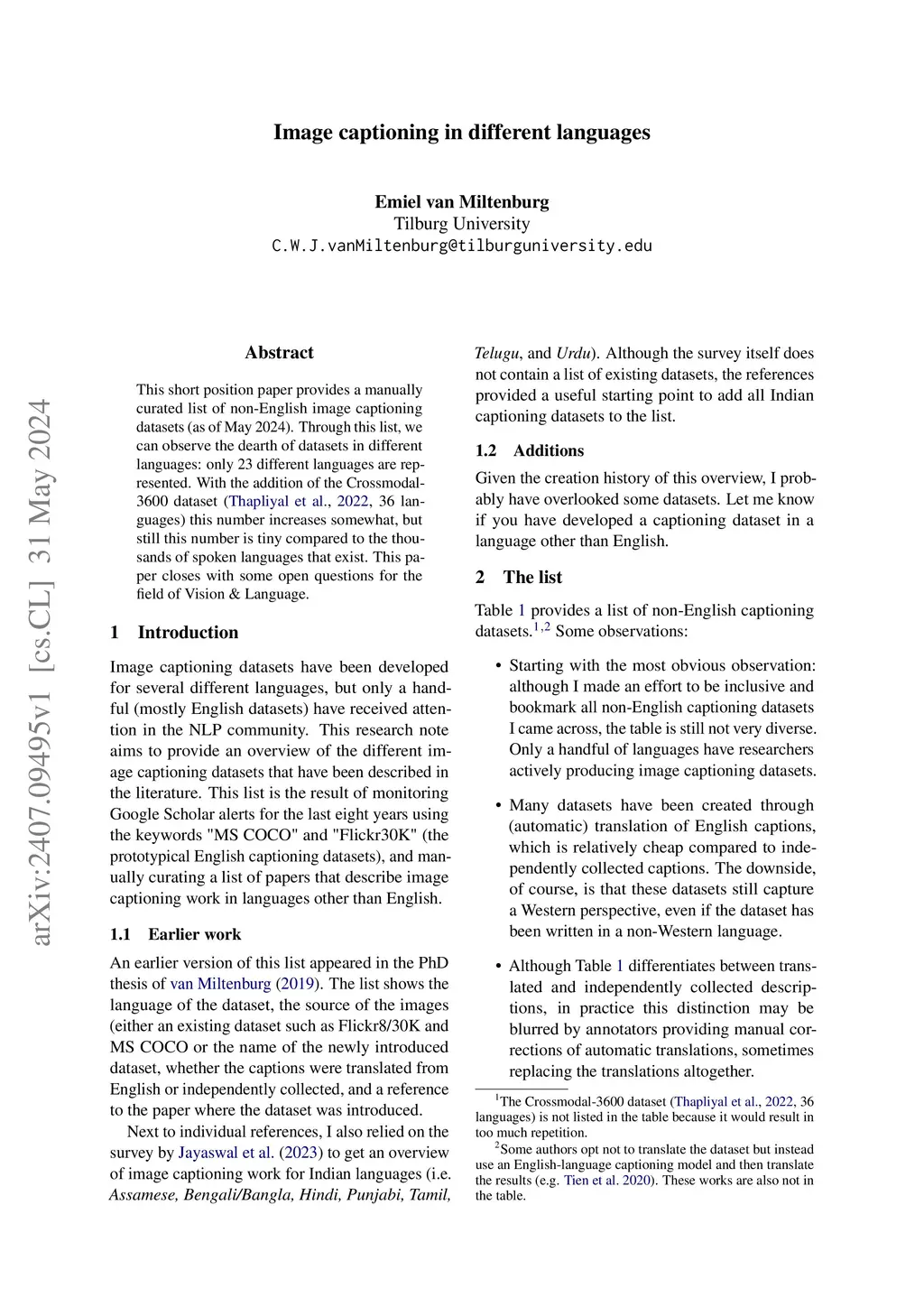 This short position paper provides a manually curated list of non-English image captioning datasets (as of May 2024). Through this list, we can observe the dearth of datasets in different languages: only 23 different languages are represented. With the addition of the Crossmodal-3600 dataset (Thapliyal et al., 2022, 36 languages) this number increases somewhat, but still this number is small compared to the +/-500 institutional languages that are out there. This paper closes with some open questions for the field of Vision & Language.