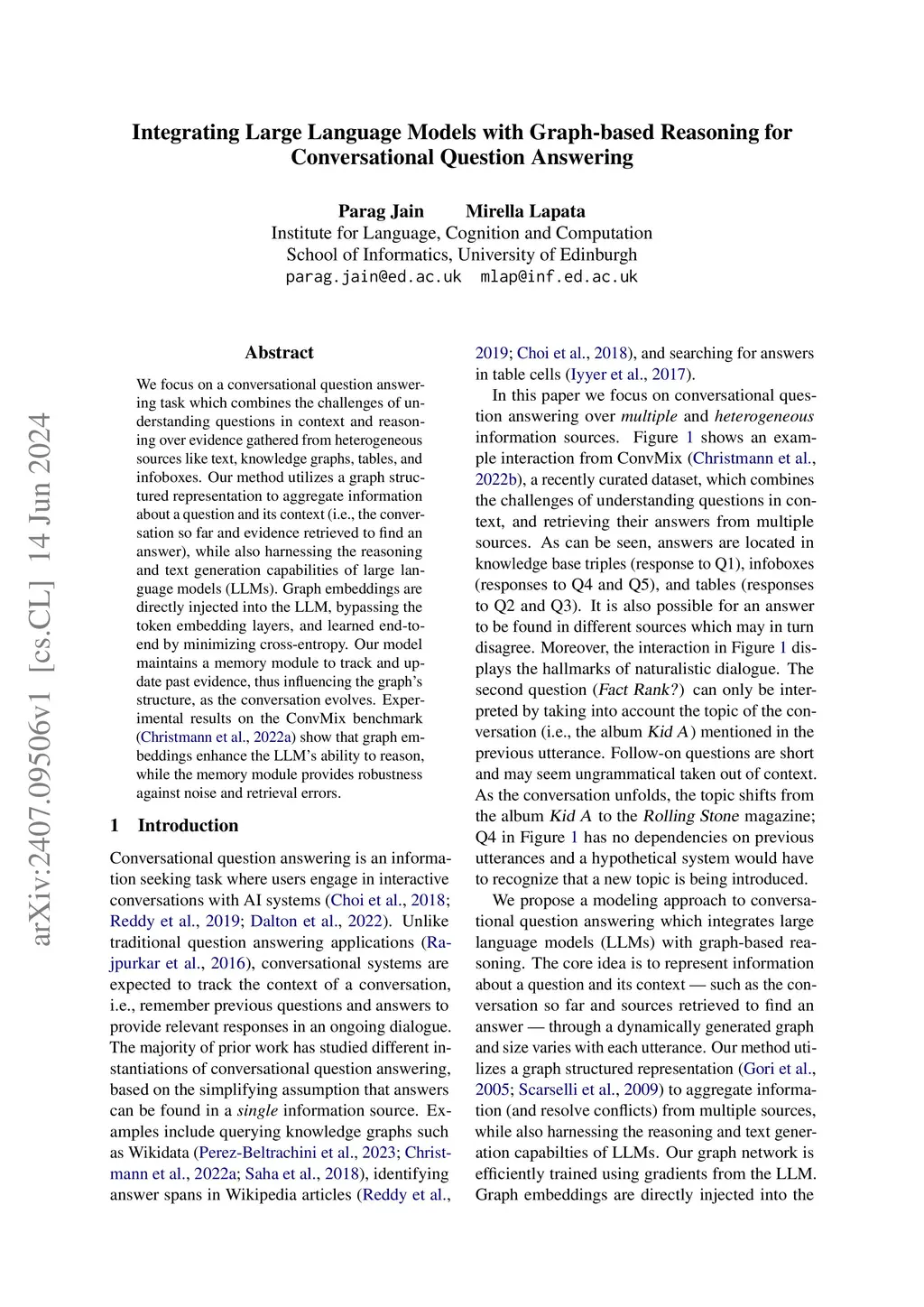 We focus on a conversational question answering task which combines the challenges of understanding questions in context and reasoning over evidence gathered from heterogeneous sources like text, knowledge graphs, tables, and infoboxes. Our method utilizes a graph structured representation to aggregate information about a question and its context (i.e., the conversation so far and evidence retrieved to find an answer), while also harnessing the reasoning and text generation capabilities of large language models (LLMs). Graph embeddings are directly injected into the LLM, bypassing the token embedding layers, and learned end-to-end by minimizing cross-entropy. Our model maintains a memory module to track and update past evidence, thus influencing the graph's structure, as the conversation evolves. Experimental results on the ConvMix benchmark(Christmann et al., 2022a) show that graph embeddings enhance the LLM's ability to reason, while the memory module provides robustness against noise and retrieval errors.