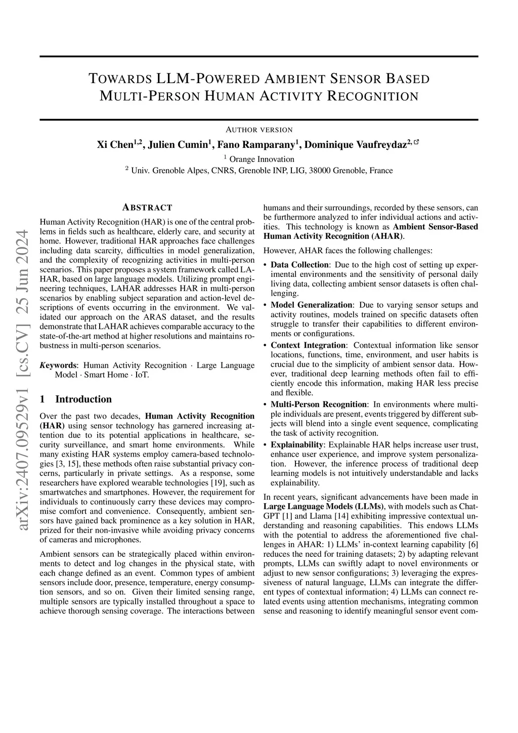 Human Activity Recognition (HAR) is one of the central problems in fields such as healthcare, elderly care, and security at home. However, traditional HAR approaches face challenges including data scarcity, difficulties in model generalization, and the complexity of recognizing activities in multi-person scenarios. This paper proposes a system framework called LAHAR, based on large language models. Utilizing prompt engineering techniques, LAHAR addresses HAR in multi-person scenarios by enabling subject separation and action-level descriptions of events occurring in the environment. We validated our approach on the ARAS dataset, and the results demonstrate that LAHAR achieves comparable accuracy to the state-of-the-art method at higher resolutions and maintains robustness in multi-person scenarios.