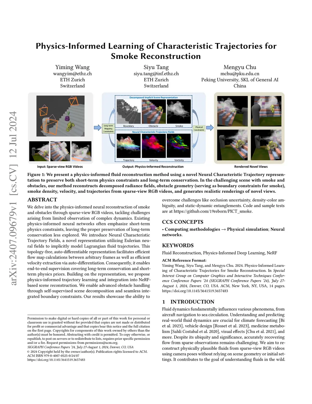 We delve into the physics-informed neural reconstruction of smoke and obstacles through sparse-view RGB videos, tackling challenges arising from limited observation of complex dynamics. Existing physics-informed neural networks often emphasize short-term physics constraints, leaving the proper preservation of long-term conservation less explored. We introduce Neural Characteristic Trajectory Fields, a novel representation utilizing Eulerian neural fields to implicitly model Lagrangian fluid trajectories. This topology-free, auto-differentiable representation facilitates efficient flow map calculations between arbitrary frames as well as efficient velocity extraction via auto-differentiation. Consequently, it enables end-to-end supervision covering long-term conservation and short-term physics priors. Building on the representation, we propose physics-informed trajectory learning and integration into NeRF-based scene reconstruction. We enable advanced obstacle handling through self-supervised scene decomposition and seamless integrated boundary constraints. Our results showcase the ability to overcome challenges like occlusion uncertainty, density-color ambiguity, and static-dynamic entanglements. Code and sample tests are at \url{https://github.com/19reborn/PICT_smoke}.
