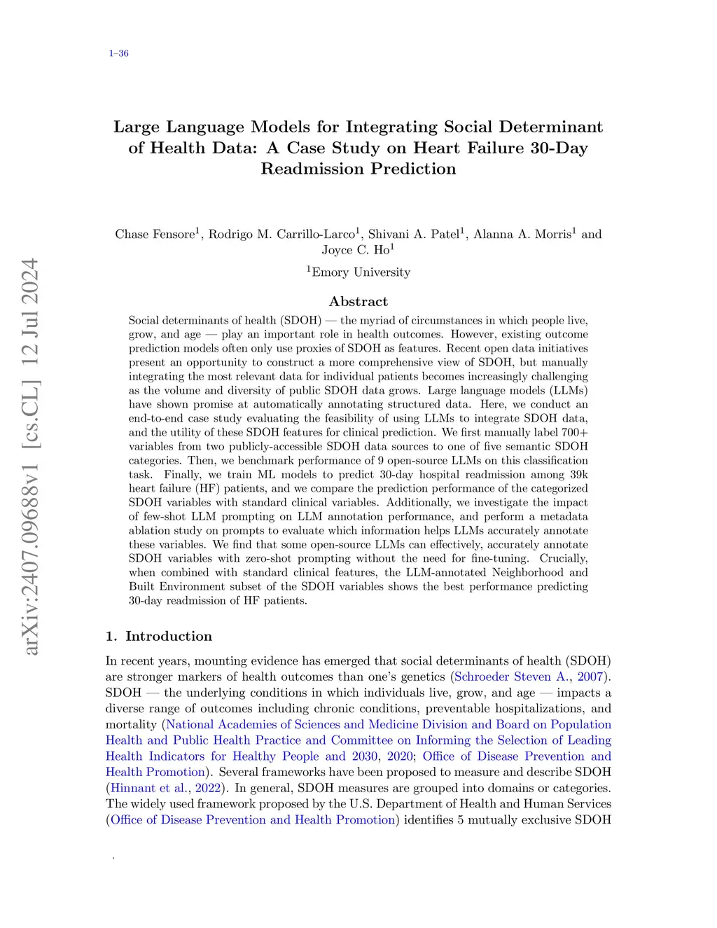 Social determinants of health (SDOH) the myriad of circumstances in which people live, grow, and age play an important role in health outcomes. However, existing outcome prediction models often only use proxies of SDOH as features. Recent open data initiatives present an opportunity to construct a more comprehensive view of SDOH, but manually integrating the most relevant data for individual patients becomes increasingly challenging as the volume and diversity of public SDOH data grows. Large language models (LLMs) have shown promise at automatically annotating structured data. Here, we conduct an end-to-end case study evaluating the feasibility of using LLMs to integrate SDOH data, and the utility of these SDOH features for clinical prediction. We first manually label 700+ variables from two publicly-accessible SDOH data sources to one of five semantic SDOH categories. Then, we benchmark performance of 9 open-source LLMs on this classification task. Finally, we train ML models to predict 30-day hospital readmission among 39k heart failure (HF) patients, and we compare the prediction performance of the categorized SDOH variables with standard clinical variables. Additionally, we investigate the impact of few-shot LLM prompting on LLM annotation performance, and perform a metadata ablation study on prompts to evaluate which information helps LLMs accurately annotate these variables. We find that some open-source LLMs can effectively, accurately annotate SDOH variables with zero-shot prompting without the need for fine-tuning. Crucially, when combined with standard clinical features, the LLM-annotated Neighborhood and Built Environment subset of the SDOH variables shows the best performance predicting 30-day readmission of HF patients.