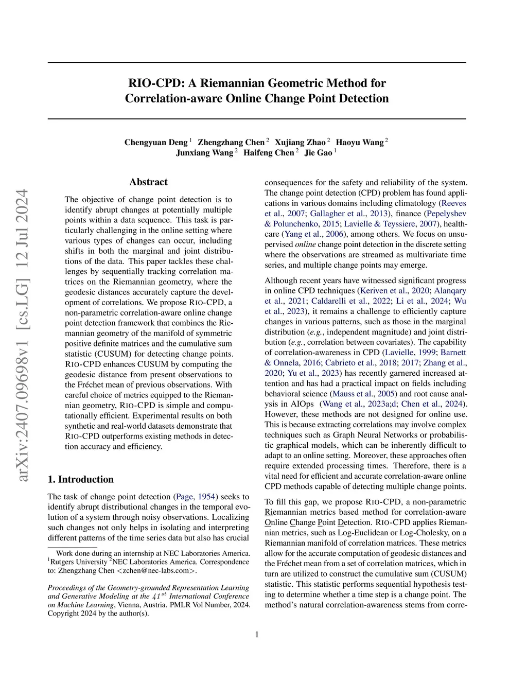 RIO-CPD: A Riemannian Geometric Method for Correlation-aware Online