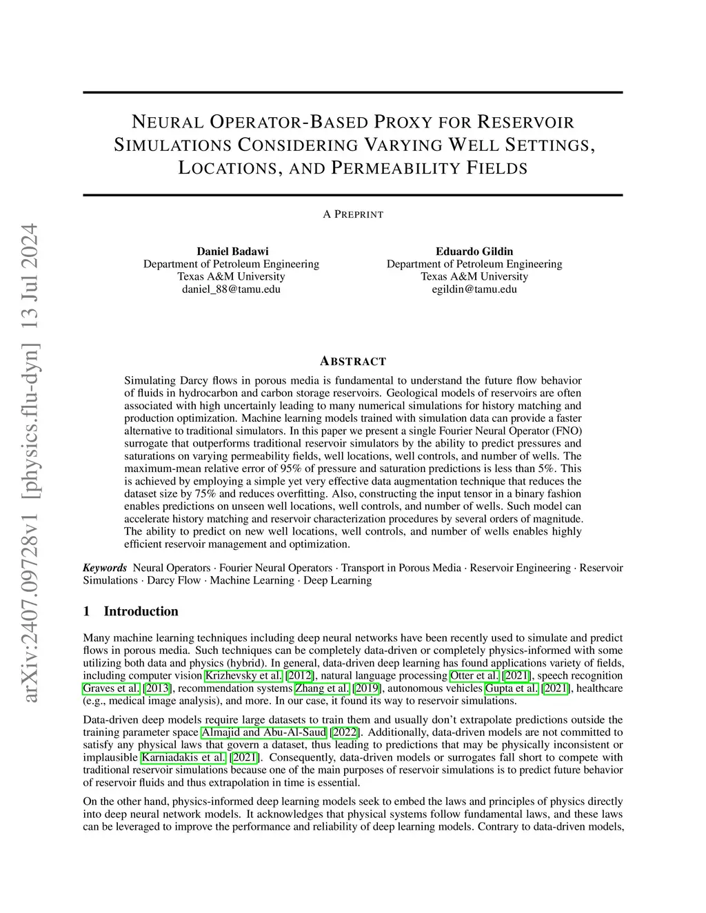 Simulating Darcy flows in porous media is fundamental to understand the future flow behavior of fluids in hydrocarbon and carbon storage reservoirs. Geological models of reservoirs are often associated with high uncertainly leading to many numerical simulations for history matching and production optimization. Machine learning models trained with simulation data can provide a faster alternative to traditional simulators. In this paper we present a single Fourier Neural Operator (FNO) surrogate that outperforms traditional reservoir simulators by the ability to predict pressures and saturations on varying permeability fields, well locations, well controls, and number of wells. The maximum-mean relative error of 95\% of pressure and saturation predictions is less than 5\%. This is achieved by employing a simple yet very effective data augmentation technique that reduces the dataset size by 75\% and reduces overfitting. Also, constructing the input tensor in a binary fashion enables predictions on unseen well locations, well controls, and number of wells. Such model can accelerate history matching and reservoir characterization procedures by several orders of magnitude. The ability to predict on new well locations, well controls, and number of wells enables highly efficient reservoir management and optimization.