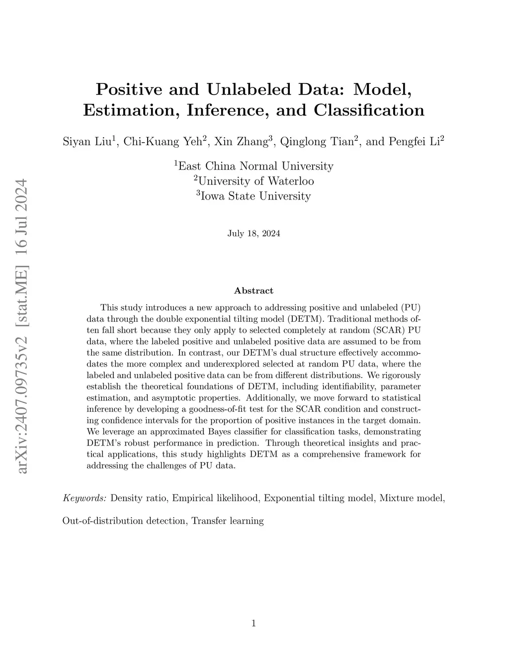 This study introduces a new approach to addressing positive and unlabeled (PU) data through the double exponential tilting model (DETM). Traditional methods often fall short because they only apply to selected completely at random (SCAR) PU data, where the labeled positive and unlabeled positive data are assumed to be from the same distribution. In contrast, our DETM's dual structure effectively accommodates the more complex and underexplored selected at random PU data, where the labeled and unlabeled positive data can be from different distributions. We rigorously establish the theoretical foundations of DETM, including identifiability, parameter estimation, and asymptotic properties. Additionally, we move forward to statistical inference by developing a goodness-of-fit test for the SCAR condition and constructing confidence intervals for the proportion of positive instances in the target domain. We leverage an approximated Bayes classifier for classification tasks, demonstrating DETM's robust performance in prediction. Through theoretical insights and practical applications, this study highlights DETM as a comprehensive framework for addressing the challenges of PU data.
