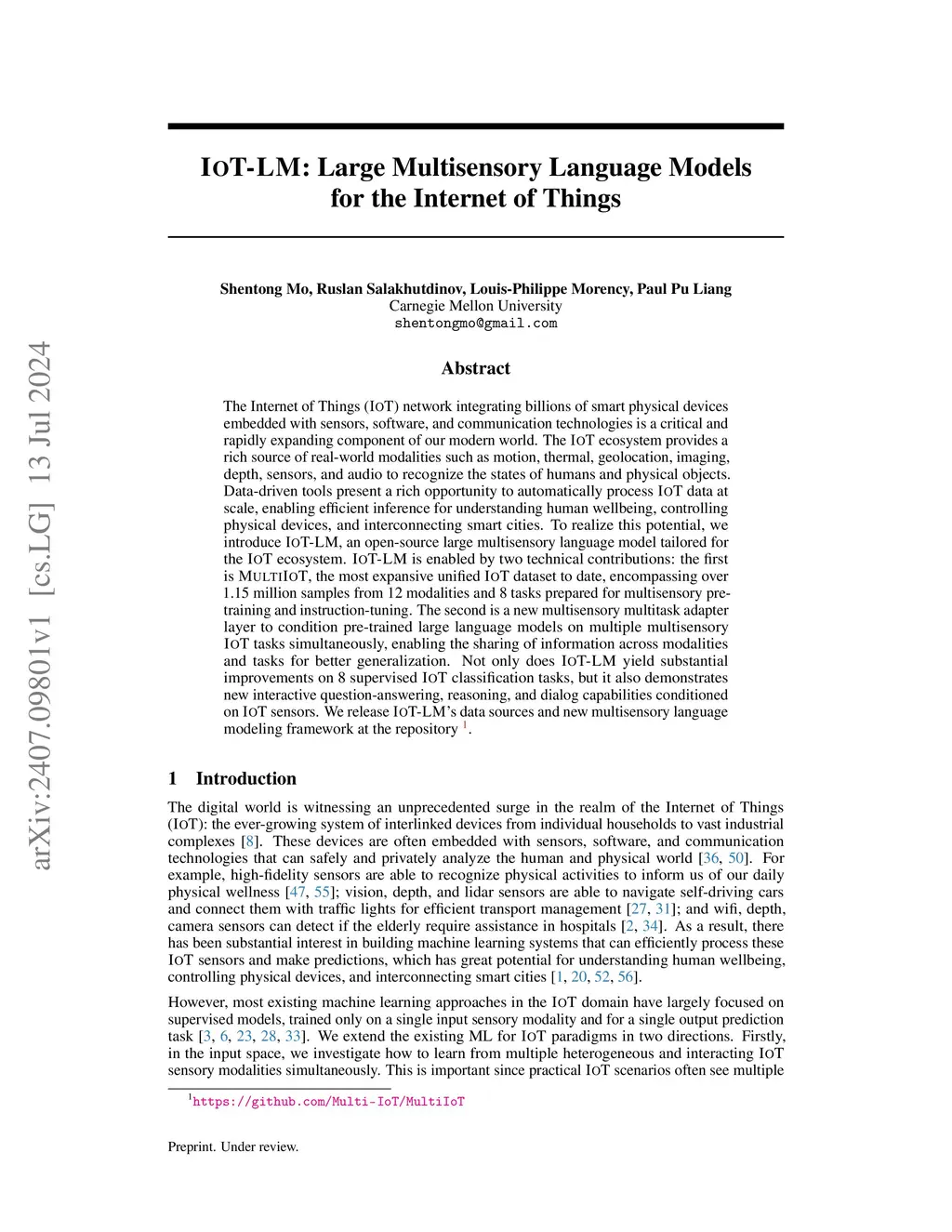 The Internet of Things (IoT) network integrating billions of smart physical devices embedded with sensors, software, and communication technologies is a critical and rapidly expanding component of our modern world. The IoT ecosystem provides a rich source of real-world modalities such as motion, thermal, geolocation, imaging, depth, sensors, and audio to recognize the states of humans and physical objects. Machine learning presents a rich opportunity to automatically process IoT data at scale, enabling efficient inference for understanding human wellbeing, controlling physical devices, and interconnecting smart cities. To realize this potential, we introduce IoT-LM, an open-source large multisensory language model tailored for the IoT ecosystem. IoT-LM is enabled by two technical contributions: the first is MultiIoT, the most expansive unified IoT dataset to date, encompassing over 1.15 million samples from 12 modalities and 8 tasks prepared for multisensory pre-training and instruction-tuning. The second is a new multisensory multitask adapter layer to condition pre-trained large language models on multisensory IoT data. Not only does IoT-LM yield substantial improvements on 8 supervised IoT classification tasks, but it also demonstrates new interactive question-answering, reasoning, and dialog capabilities conditioned on IoT sensors. We release IoT-LM's data sources and new multisensory language modeling framework.