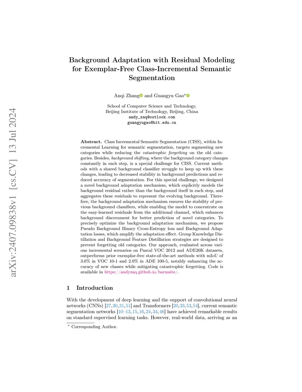 Class Incremental Semantic Segmentation~(CISS), within Incremental Learning for semantic segmentation, targets segmenting new categories while reducing the catastrophic forgetting on the old categories.Besides, background shifting, where the background category changes constantly in each step, is a special challenge for CISS. Current methods with a shared background classifier struggle to keep up with these changes, leading to decreased stability in background predictions and reduced accuracy of segmentation. For this special challenge, we designed a novel background adaptation mechanism, which explicitly models the background residual rather than the background itself in each step, and aggregates these residuals to represent the evolving background. Therefore, the background adaptation mechanism ensures the stability of previous background classifiers, while enabling the model to concentrate on the easy-learned residuals from the additional channel, which enhances background discernment for better prediction of novel categories. To precisely optimize the background adaptation mechanism, we propose Pseudo Background Binary Cross-Entropy loss and Background Adaptation losses, which amplify the adaptation effect. Group Knowledge Distillation and Background Feature Distillation strategies are designed to prevent forgetting old categories. Our approach, evaluated across various incremental scenarios on Pascal VOC 2012 and ADE20K datasets, outperforms prior exemplar-free state-of-the-art methods with mIoU of 3.0% in VOC 10-1 and 2.0% in ADE 100-5, notably enhancing the accuracy of new classes while mitigating catastrophic forgetting. Code is available in https://andyzaq.github.io/barmsite/.