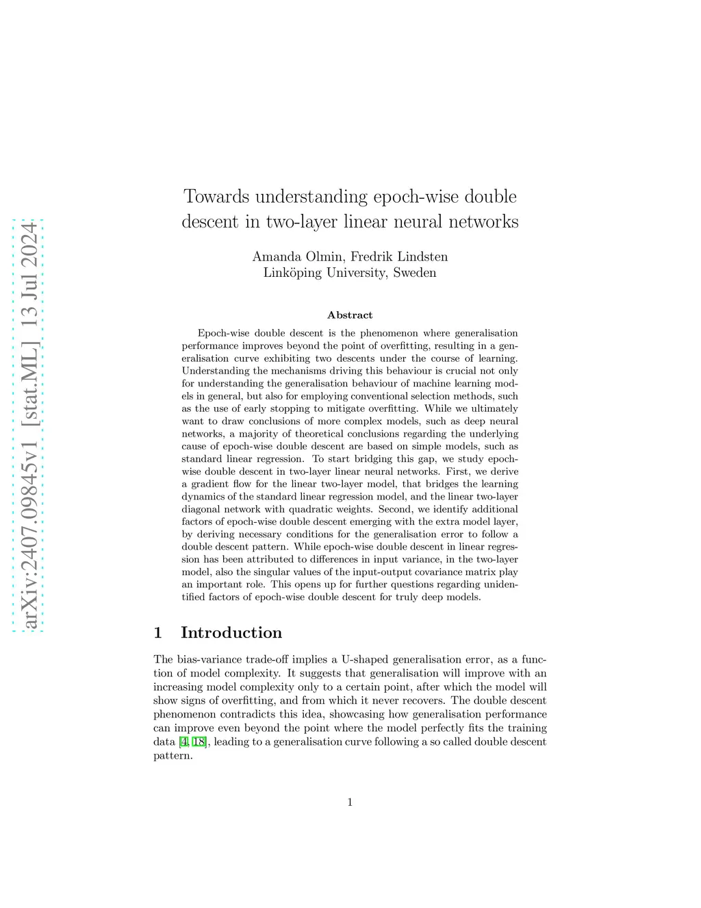 Epoch-wise double descent is the phenomenon where generalisation performance improves beyond the point of overfitting, resulting in a generalisation curve exhibiting two descents under the course of learning. Understanding the mechanisms driving this behaviour is crucial not only for understanding the generalisation behaviour of machine learning models in general, but also for employing conventional selection methods, such as the use of early stopping to mitigate overfitting. While we ultimately want to draw conclusions of more complex models, such as deep neural networks, a majority of theoretical conclusions regarding the underlying cause of epoch-wise double descent are based on simple models, such as standard linear regression. To start bridging this gap, we study epoch-wise double descent in two-layer linear neural networks. First, we derive a gradient flow for the linear two-layer model, that bridges the learning dynamics of the standard linear regression model, and the linear two-layer diagonal network with quadratic weights. Second, we identify additional factors of epoch-wise double descent emerging with the extra model layer, by deriving necessary conditions for the generalisation error to follow a double descent pattern. While epoch-wise double descent in linear regression has been attributed to differences in input variance, in the two-layer model, also the singular values of the input-output covariance matrix play an important role. This opens up for further questions regarding unidentified factors of epoch-wise double descent for truly deep models.