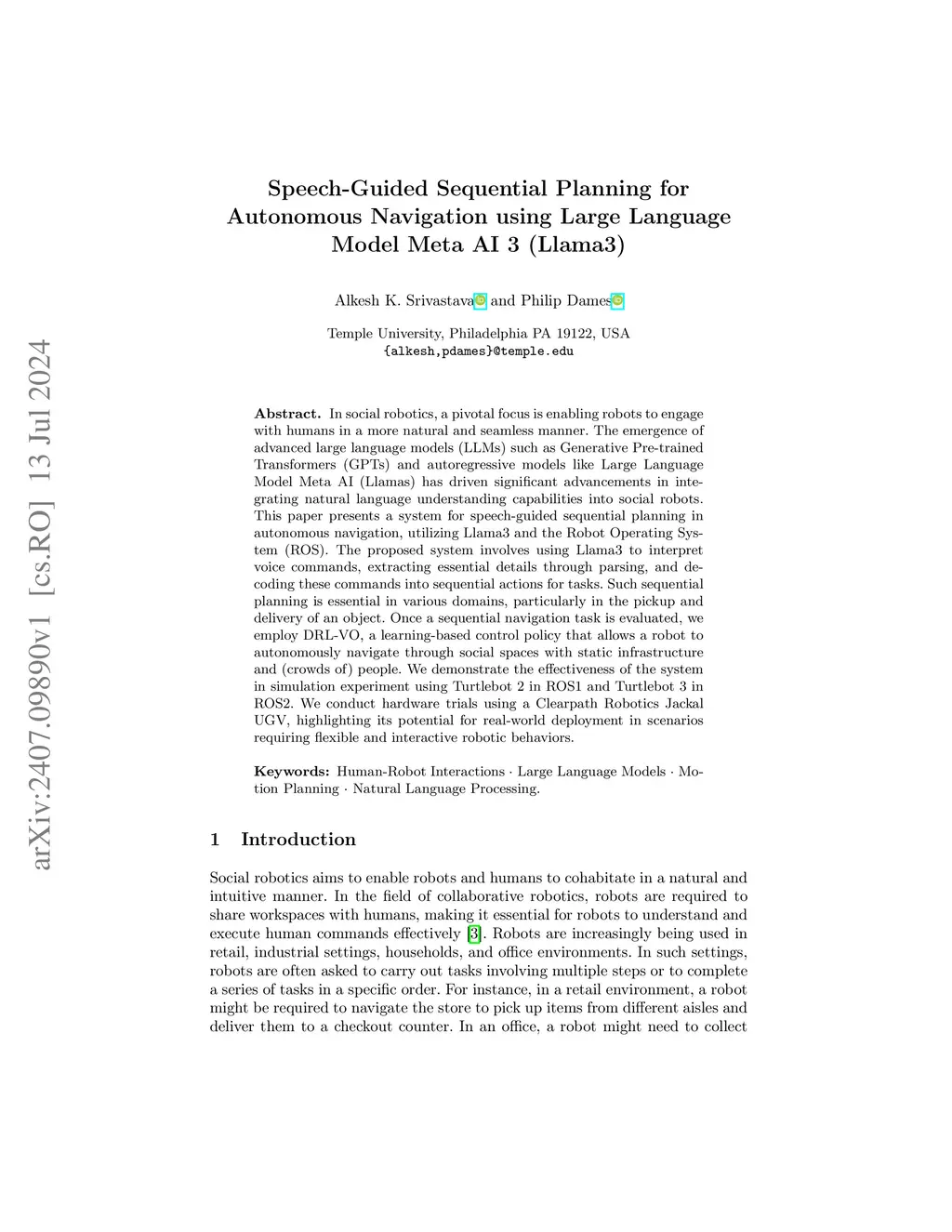 In social robotics, a pivotal focus is enabling robots to engage with humans in a more natural and seamless manner. The emergence of advanced large language models (LLMs) such as Generative Pre-trained Transformers (GPTs) and autoregressive models like Large Language Model Meta AI (Llamas) has driven significant advancements in integrating natural language understanding capabilities into social robots. This paper presents a system for speech-guided sequential planning in autonomous navigation, utilizing Llama3 and the Robot Operating System~(ROS). The proposed system involves using Llama3 to interpret voice commands, extracting essential details through parsing, and decoding these commands into sequential actions for tasks. Such sequential planning is essential in various domains, particularly in the pickup and delivery of an object. Once a sequential navigation task is evaluated, we employ DRL-VO, a learning-based control policy that allows a robot to autonomously navigate through social spaces with static infrastructure and (crowds of) people. We demonstrate the effectiveness of the system in simulation experiment using Turtlebot 2 in ROS1 and Turtlebot 3 in ROS2. We conduct hardware trials using a Clearpath Robotics Jackal UGV, highlighting its potential for real-world deployment in scenarios requiring flexible and interactive robotic behaviors.