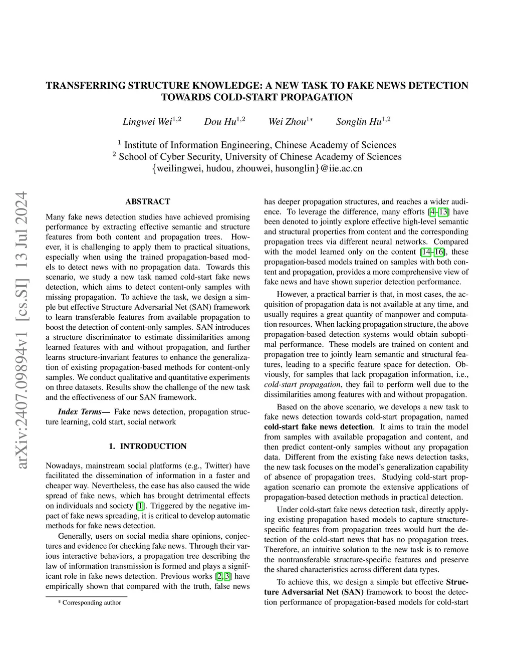 Many fake news detection studies have achieved promising performance by extracting effective semantic and structure features from both content and propagation trees. However, it is challenging to apply them to practical situations, especially when using the trained propagation-based models to detect news with no propagation data. Towards this scenario, we study a new task named cold-start fake news detection, which aims to detect content-only samples with missing propagation. To achieve the task, we design a simple but effective Structure Adversarial Net (SAN) framework to learn transferable features from available propagation to boost the detection of content-only samples. SAN introduces a structure discriminator to estimate dissimilarities among learned features with and without propagation, and further learns structure-invariant features to enhance the generalization of existing propagation-based methods for content-only samples. We conduct qualitative and quantitative experiments on three datasets. Results show the challenge of the new task and the effectiveness of our SAN framework.