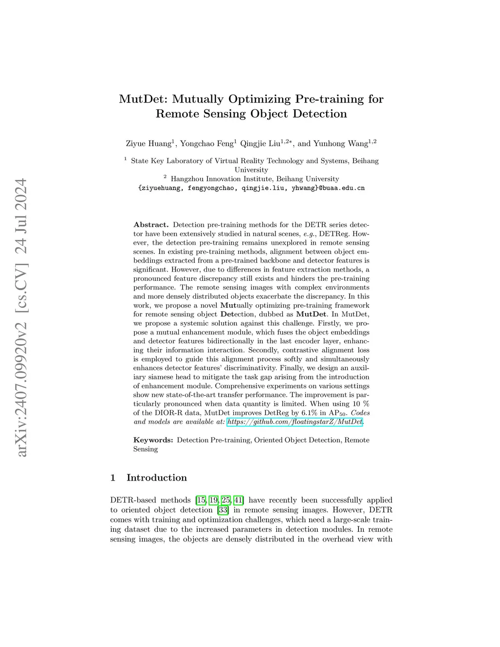 MutDet: Mutually Optimizing Pre-training for Remote Sensing Object