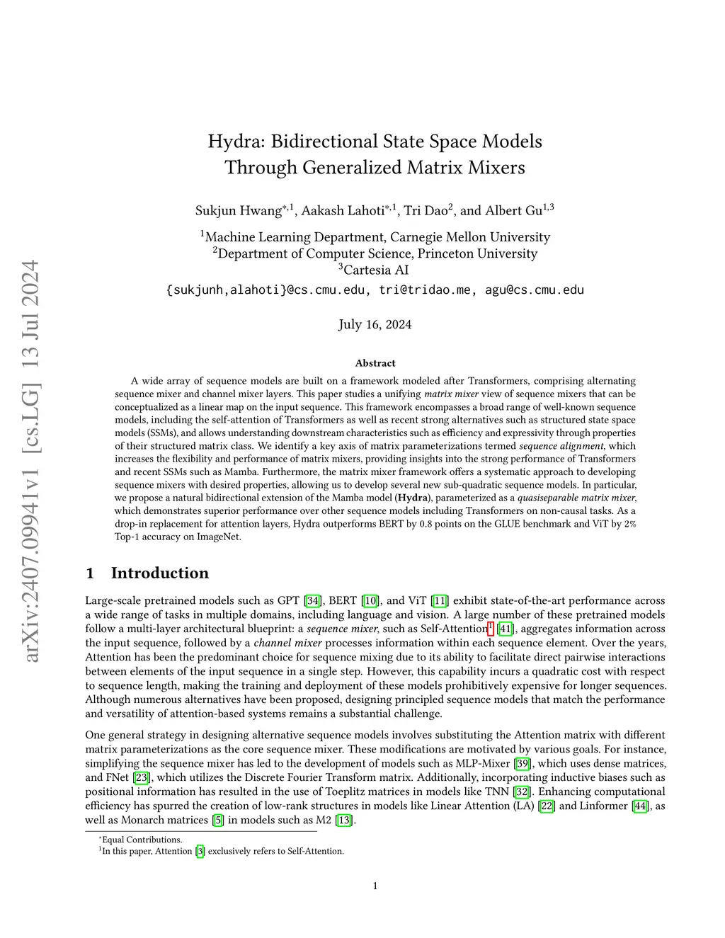 Hydra: Bidirectional State Space Models Through Generalized Matrix