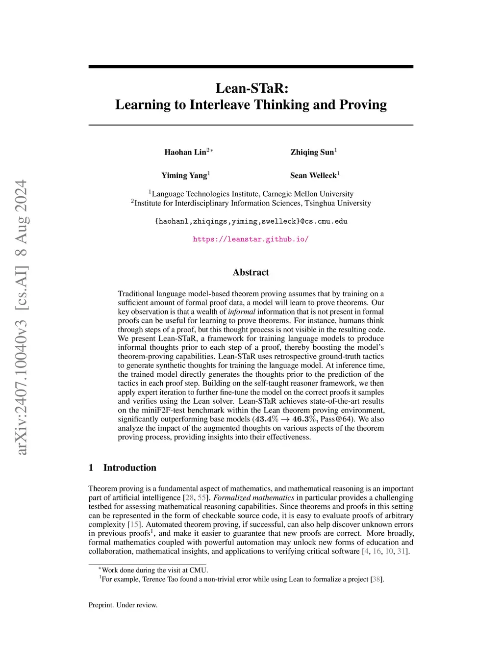 Traditional language model-based theorem proving assumes that by training on a sufficient amount of formal proof data, a model will learn to prove theorems. Our key observation is that a wealth of informal information that is not present in formal proofs can be useful for learning to prove theorems. For instance, humans think through steps of a proof, but this thought process is not visible in the resulting code. We present Lean-STaR, a framework for training language models to produce informal thoughts prior to each step of a proof, thereby boosting the model's theorem-proving capabilities. Lean-STaR uses retrospective ground-truth tactics to generate synthetic thoughts for training the language model. At inference time, the trained model directly generates the thoughts prior to the prediction of the tactics in each proof step. Building on the self-taught reasoner framework, we then apply expert iteration to further fine-tune the model on the correct proofs it samples and verifies using the Lean solver. Lean-STaR achieves state-of-the-art results on the miniF2F-test benchmark within the Lean theorem proving environment, significantly outperforming base models ( Pass@64). We also analyze the impact of the augmented thoughts on various aspects of the theorem proving process, providing insights into their effectiveness.