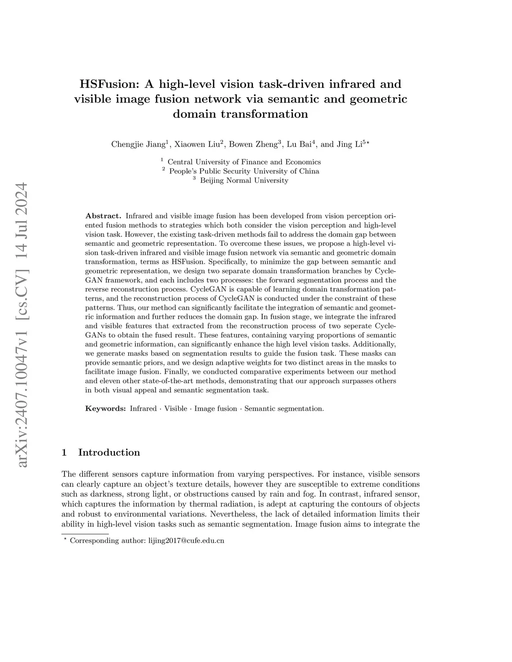 Infrared and visible image fusion has been developed from vision perception oriented fusion methods to strategies which both consider the vision perception and high-level vision task. However, the existing task-driven methods fail to address the domain gap between semantic and geometric representation. To overcome these issues, we propose a high-level vision task-driven infrared and visible image fusion network via semantic and geometric domain transformation, terms as HSFusion. Specifically, to minimize the gap between semantic and geometric representation, we design two separate domain transformation branches by CycleGAN framework, and each includes two processes: the forward segmentation process and the reverse reconstruction process. CycleGAN is capable of learning domain transformation patterns, and the reconstruction process of CycleGAN is conducted under the constraint of these patterns. Thus, our method can significantly facilitate the integration of semantic and geometric information and further reduces the domain gap. In fusion stage, we integrate the infrared and visible features that extracted from the reconstruction process of two seperate CycleGANs to obtain the fused result. These features, containing varying proportions of semantic and geometric information, can significantly enhance the high level vision tasks. Additionally, we generate masks based on segmentation results to guide the fusion task. These masks can provide semantic priors, and we design adaptive weights for two distinct areas in the masks to facilitate image fusion. Finally, we conducted comparative experiments between our method and eleven other state-of-the-art methods, demonstrating that our approach surpasses others in both visual appeal and semantic segmentation task.