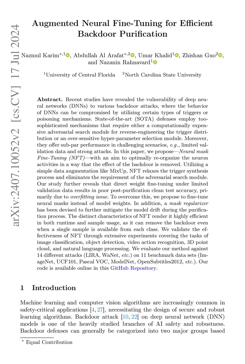 Recent studies have revealed the vulnerability of deep neural networks (DNNs) to various backdoor attacks, where the behavior of DNNs can be compromised by utilizing certain types of triggers or poisoning mechanisms. State-of-the-art (SOTA) defenses employ too-sophisticated mechanisms that require either a computationally expensive adversarial search module for reverse-engineering the trigger distribution or an over-sensitive hyper-parameter selection module. Moreover, they offer sub-par performance in challenging scenarios, e.g., limited validation data and strong attacks. In this paper, we propose Neural mask Fine-Tuning (NFT) with an aim to optimally re-organize the neuron activities in a way that the effect of the backdoor is removed. Utilizing a simple data augmentation like MixUp, NFT relaxes the trigger synthesis process and eliminates the requirement of the adversarial search module. Our study further reveals that direct weight fine-tuning under limited validation data results in poor post-purification clean test accuracy, primarily due to overfitting issue. To overcome this, we propose to fine-tune neural masks instead of model weights. In addition, a mask regularizer has been devised to further mitigate the model drift during the purification process. The distinct characteristics of NFT render it highly efficient in both runtime and sample usage, as it can remove the backdoor even when a single sample is available from each class. We validate the effectiveness of NFT through extensive experiments covering the tasks of image classification, object detection, video action recognition, 3D point cloud, and natural language processing. We evaluate our method against 14 different attacks (LIRA, WaNet, etc.) on 11 benchmark data sets such as ImageNet, UCF101, Pascal VOC, ModelNet, OpenSubtitles2012, etc.