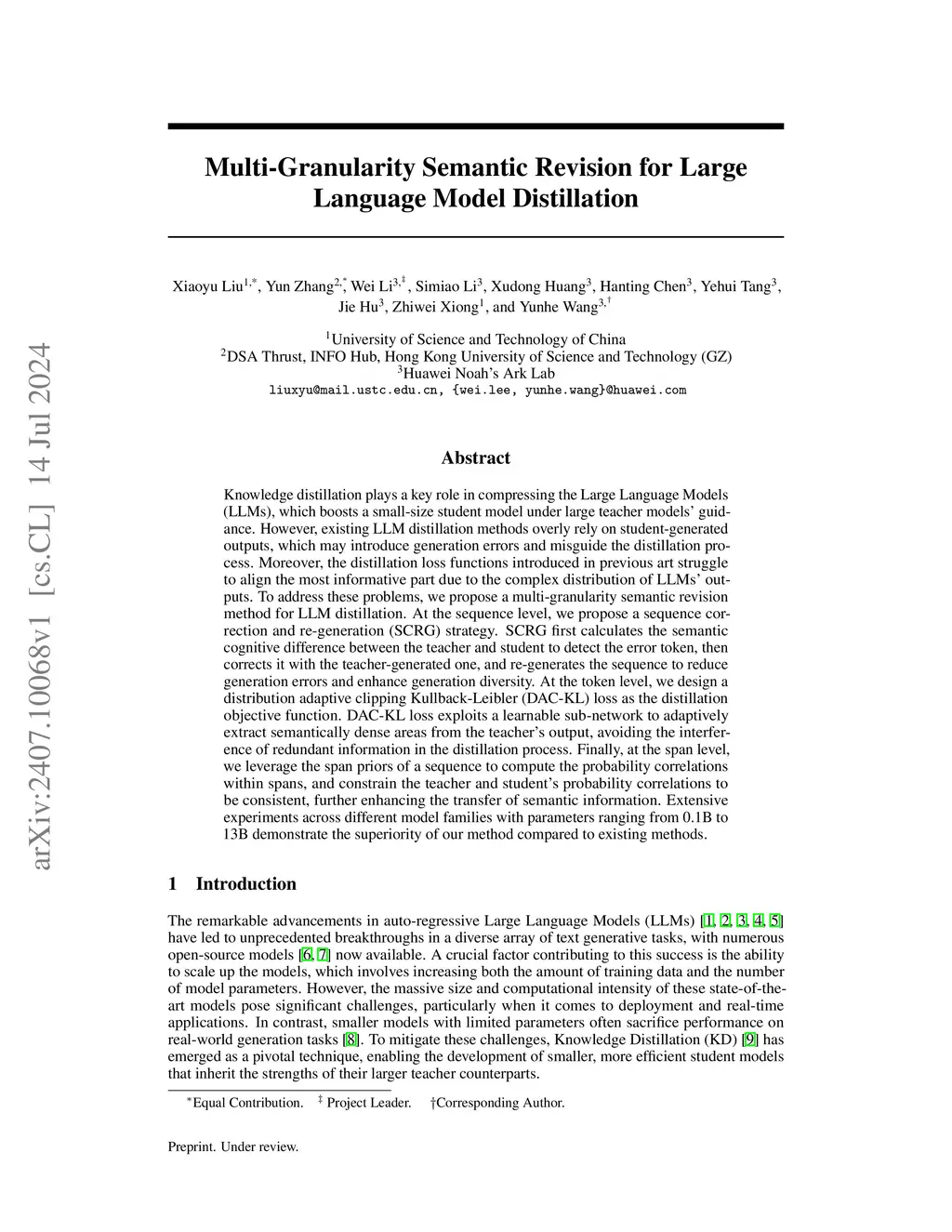 Knowledge distillation plays a key role in compressing the Large Language Models (LLMs), which boosts a small-size student model under large teacher models' guidance. However, existing LLM distillation methods overly rely on student-generated outputs, which may introduce generation errors and misguide the distillation process. Moreover, the distillation loss functions introduced in previous art struggle to align the most informative part due to the complex distribution of LLMs' outputs. To address these problems, we propose a multi-granularity semantic revision method for LLM distillation. At the sequence level, we propose a sequence correction and re-generation (SCRG) strategy. SCRG first calculates the semantic cognitive difference between the teacher and student to detect the error token, then corrects it with the teacher-generated one, and re-generates the sequence to reduce generation errors and enhance generation diversity. At the token level, we design a distribution adaptive clipping Kullback-Leibler (DAC-KL) loss as the distillation objective function. DAC-KL loss exploits a learnable sub-network to adaptively extract semantically dense areas from the teacher's output, avoiding the interference of redundant information in the distillation process. Finally, at the span level, we leverage the span priors of a sequence to compute the probability correlations within spans, and constrain the teacher and student's probability correlations to be consistent, further enhancing the transfer of semantic information. Extensive experiments across different model families with parameters ranging from 0.1B to 13B demonstrate the superiority of our method compared to existing methods.
