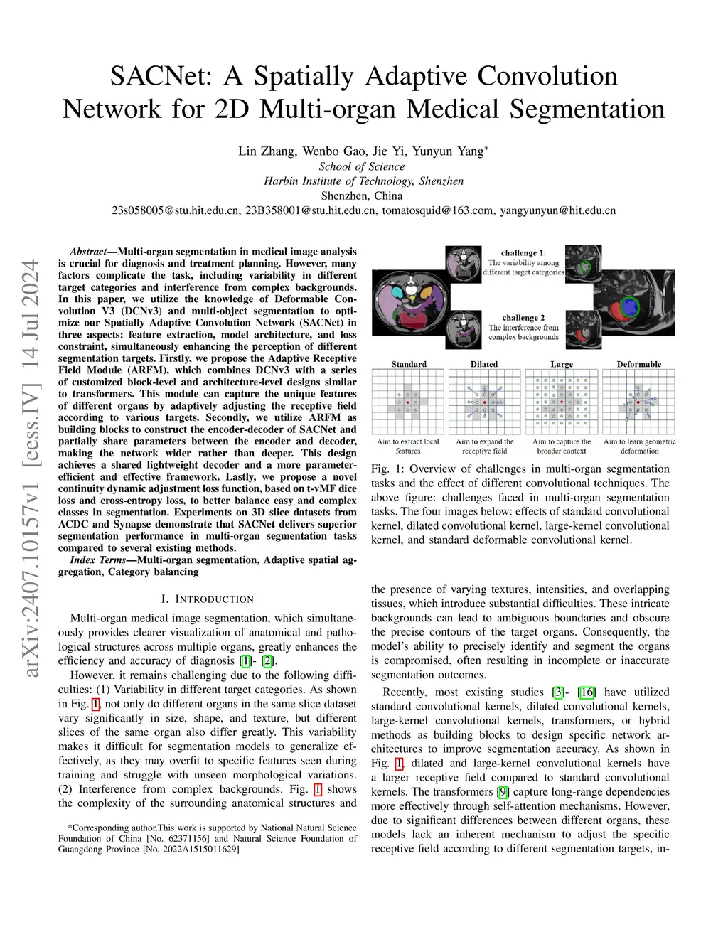 Multi-organ segmentation in medical image analysis is crucial for diagnosis and treatment planning. However, many factors complicate the task, including variability in different target categories and interference from complex backgrounds. In this paper, we utilize the knowledge of Deformable Convolution V3 (DCNv3) and multi-object segmentation to optimize our Spatially Adaptive Convolution Network (SACNet) in three aspects: feature extraction, model architecture, and loss constraint, simultaneously enhancing the perception of different segmentation targets. Firstly, we propose the Adaptive Receptive Field Module (ARFM), which combines DCNv3 with a series of customized block-level and architecture-level designs similar to transformers. This module can capture the unique features of different organs by adaptively adjusting the receptive field according to various targets. Secondly, we utilize ARFM as building blocks to construct the encoder-decoder of SACNet and partially share parameters between the encoder and decoder, making the network wider rather than deeper. This design achieves a shared lightweight decoder and a more parameter-efficient and effective framework. Lastly, we propose a novel continuity dynamic adjustment loss function, based on t-vMF dice loss and cross-entropy loss, to better balance easy and complex classes in segmentation. Experiments on 3D slice datasets from ACDC and Synapse demonstrate that SACNet delivers superior segmentation performance in multi-organ segmentation tasks compared to several existing methods.