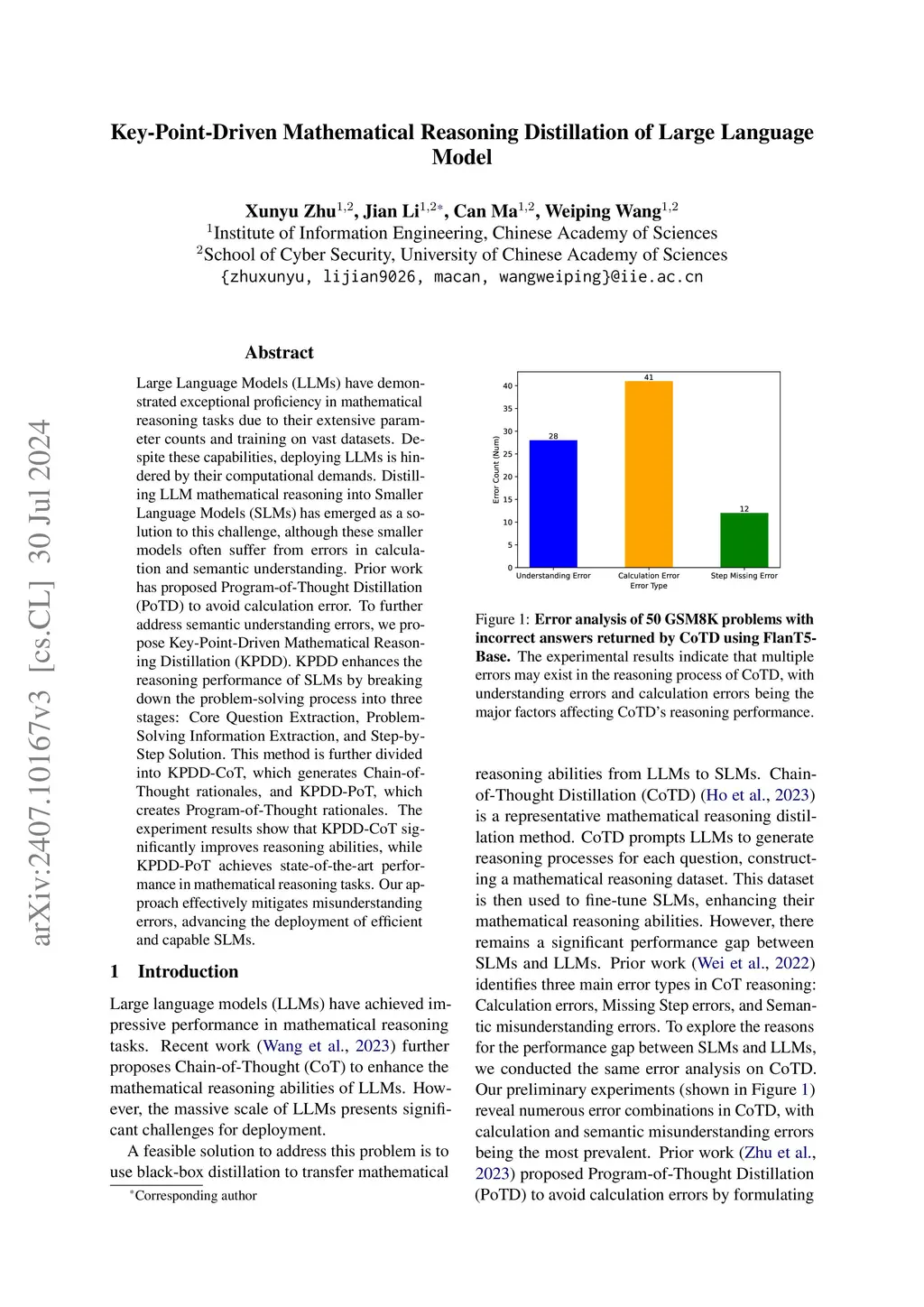 Large Language Models (LLMs) have demonstrated exceptional proficiency in mathematical reasoning tasks due to their extensive parameter counts and training on vast datasets. Despite these capabilities, deploying LLMs is hindered by their computational demands. Distilling LLM mathematical reasoning into Smaller Language Models (SLMs) has emerged as a solution to this challenge, although these smaller models often suffer from errors in calculation and semantic understanding. Prior work has proposed Program-of-Thought Distillation (PoTD) to avoid calculation error. To further address semantic understanding errors, we propose Key-Point-Driven Mathematical Reasoning Distillation (KPDD). KPDD enhances the reasoning performance of SLMs by breaking down the problem-solving process into three stages: Core Question Extraction, Problem-Solving Information Extraction, and Step-by-Step Solution. This method is further divided into KPDD-CoT, which generates Chain-of-Thought rationales, and KPDD-PoT, which creates Program-of-Thought rationales. The experiment results show that KPDD-CoT significantly improves reasoning abilities, while KPDD-PoT achieves state-of-the-art performance in mathematical reasoning tasks. Our approach effectively mitigates misunderstanding errors, advancing the deployment of efficient and capable SLMs.