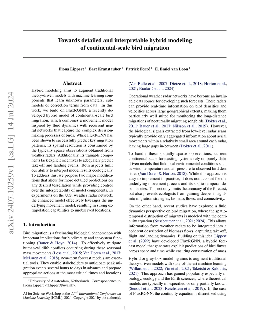 Hybrid modeling aims to augment traditional theory-driven models with machine learning components that learn unknown parameters, sub-models or correction terms from data. In this work, we build on FluxRGNN, a recently developed hybrid model of continental-scale bird migration, which combines a movement model inspired by fluid dynamics with recurrent neural networks that capture the complex decision-making processes of birds. While FluxRGNN has been shown to successfully predict key migration patterns, its spatial resolution is constrained by the typically sparse observations obtained from weather radars. Additionally, its trainable components lack explicit incentives to adequately predict take-off and landing events. Both aspects limit our ability to interpret model results ecologically. To address this, we propose two major modifications that allow for more detailed predictions on any desired tessellation while providing control over the interpretability of model components. In experiments on the U.S. weather radar network, the enhanced model effectively leverages the underlying movement model, resulting in strong extrapolation capabilities to unobserved locations.