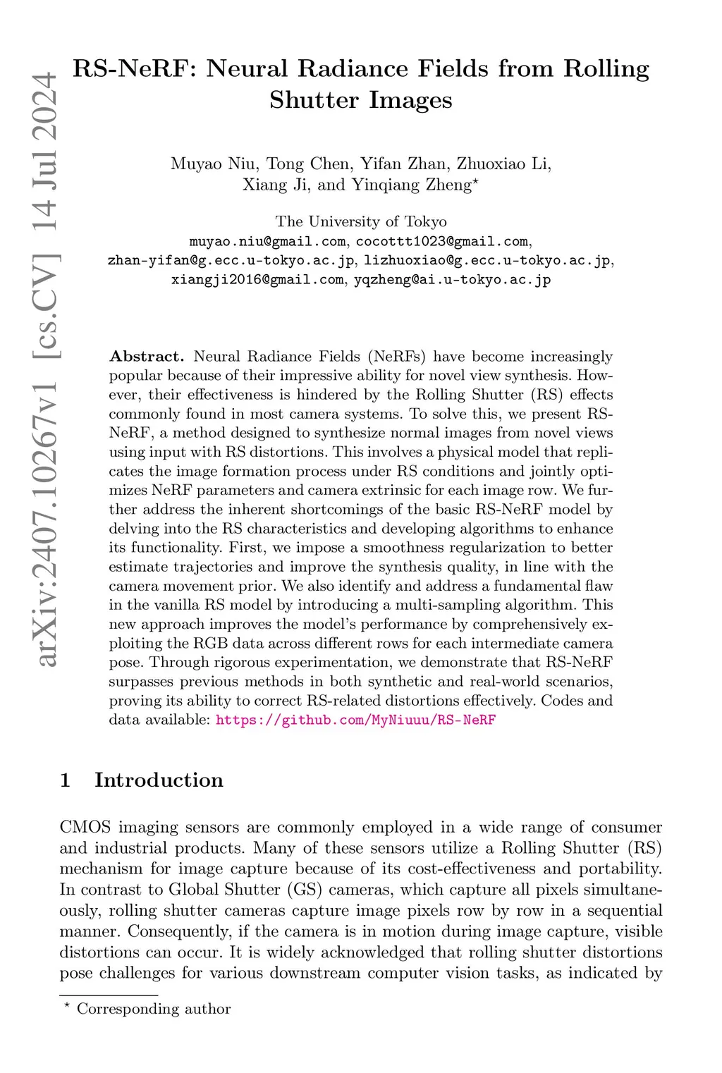 Neural Radiance Fields (NeRFs) have become increasingly popular because of their impressive ability for novel view synthesis. However, their effectiveness is hindered by the Rolling Shutter (RS) effects commonly found in most camera systems. To solve this, we present RS-NeRF, a method designed to synthesize normal images from novel views using input with RS distortions. This involves a physical model that replicates the image formation process under RS conditions and jointly optimizes NeRF parameters and camera extrinsic for each image row. We further address the inherent shortcomings of the basic RS-NeRF model by delving into the RS characteristics and developing algorithms to enhance its functionality. First, we impose a smoothness regularization to better estimate trajectories and improve the synthesis quality, in line with the camera movement prior. We also identify and address a fundamental flaw in the vanilla RS model by introducing a multi-sampling algorithm. This new approach improves the model's performance by comprehensively exploiting the RGB data across different rows for each intermediate camera pose. Through rigorous experimentation, we demonstrate that RS-NeRF surpasses previous methods in both synthetic and real-world scenarios, proving its ability to correct RS-related distortions effectively. Codes and data available: https://github.com/MyNiuuu/RS-NeRF