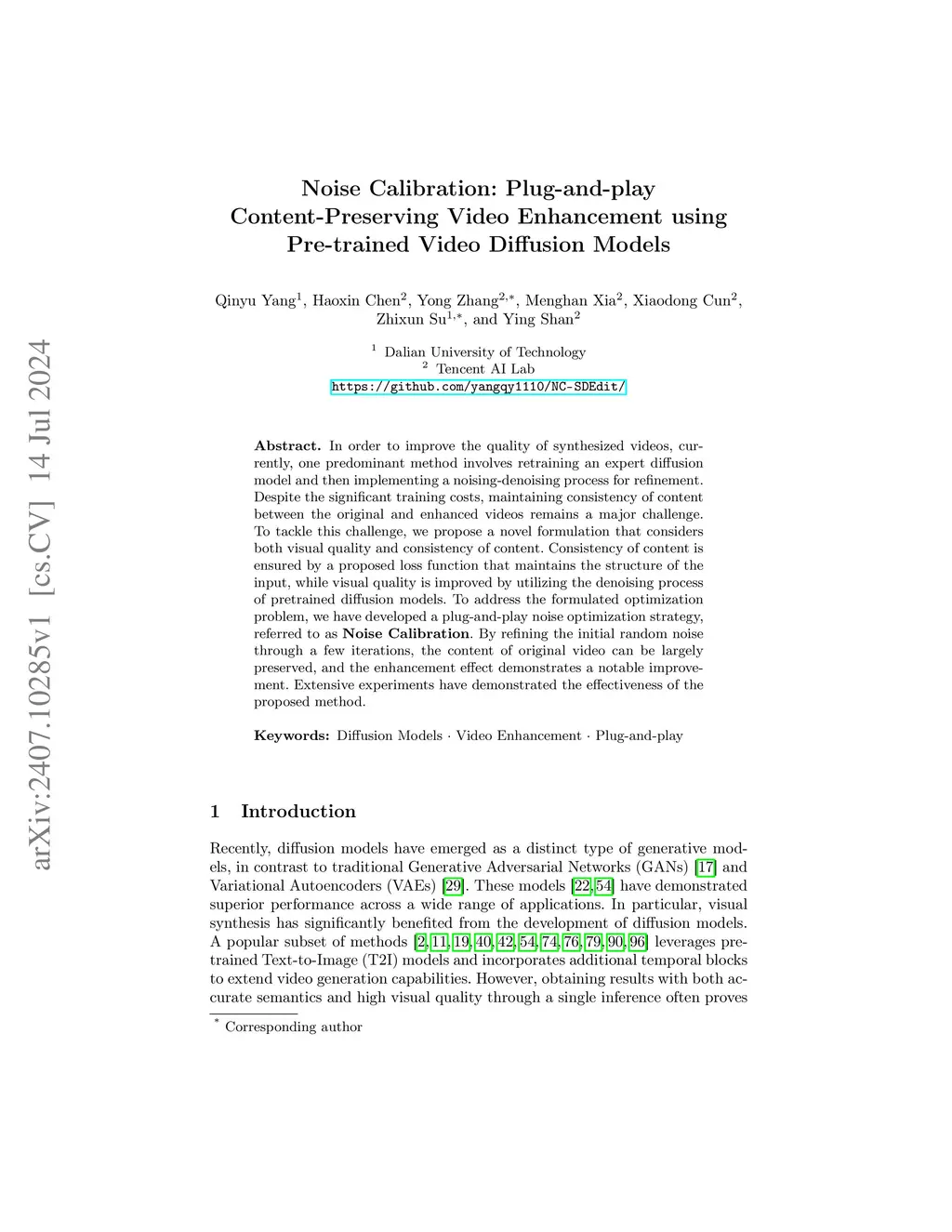 In order to improve the quality of synthesized videos, currently, one predominant method involves retraining an expert diffusion model and then implementing a noising-denoising process for refinement. Despite the significant training costs, maintaining consistency of content between the original and enhanced videos remains a major challenge. To tackle this challenge, we propose a novel formulation that considers both visual quality and consistency of content. Consistency of content is ensured by a proposed loss function that maintains the structure of the input, while visual quality is improved by utilizing the denoising process of pretrained diffusion models. To address the formulated optimization problem, we have developed a plug-and-play noise optimization strategy, referred to as Noise Calibration. By refining the initial random noise through a few iterations, the content of original video can be largely preserved, and the enhancement effect demonstrates a notable improvement. Extensive experiments have demonstrated the effectiveness of the proposed method.